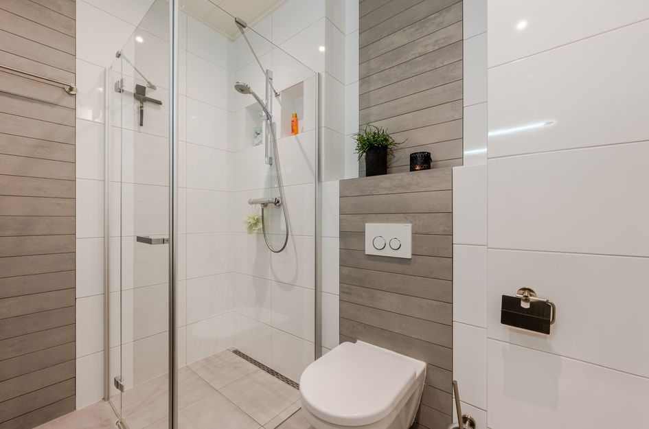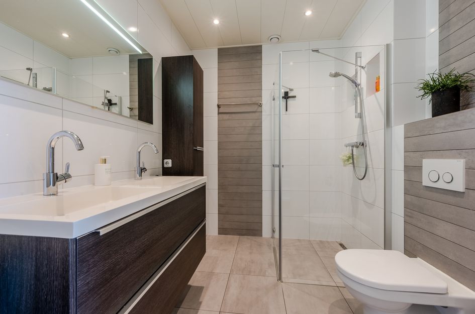 - Ruime en moderne badkamer, voorzien van douche, toilet en een groot wastafelmeubel met dubbele wastafel