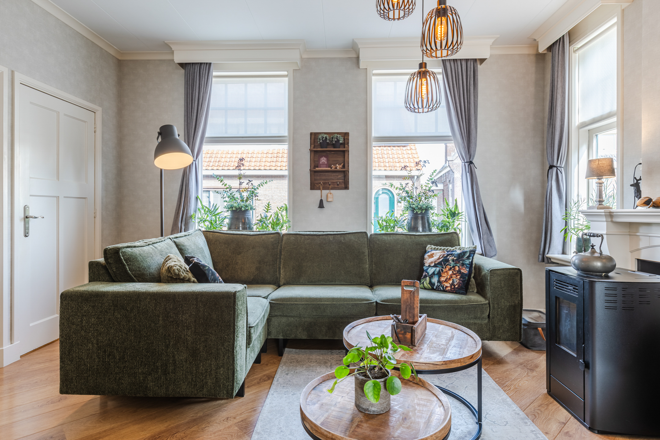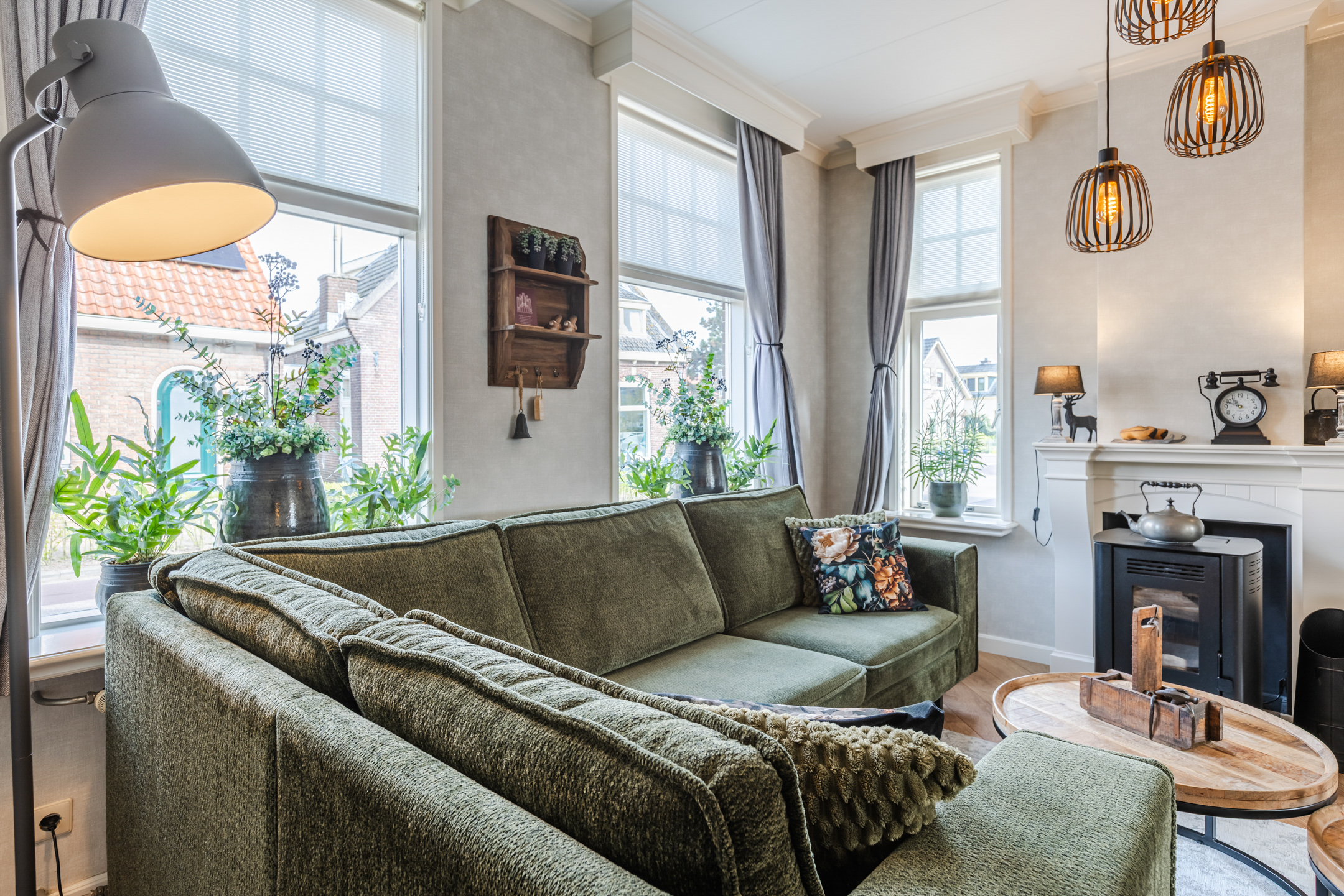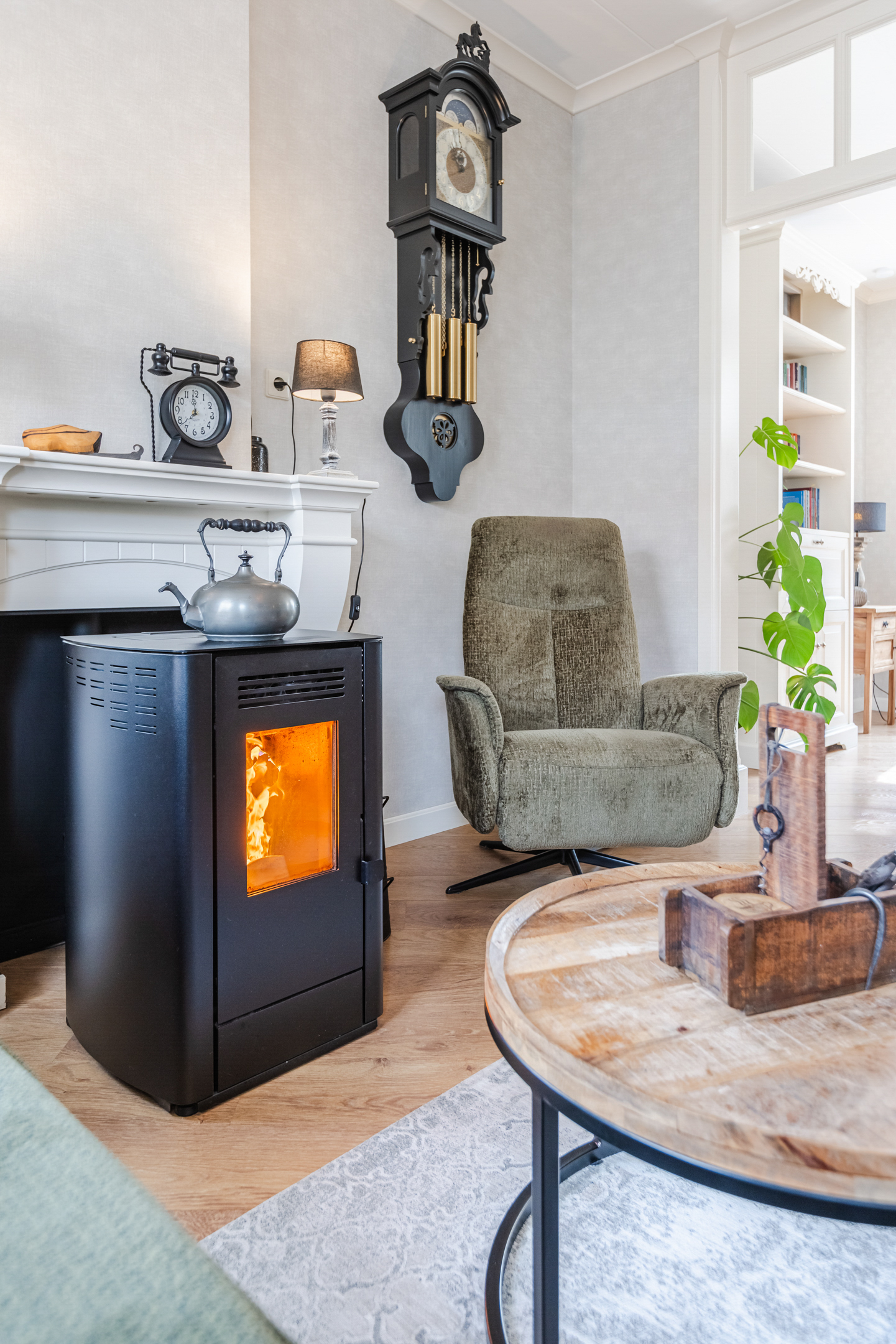 • Sfeervolle woonkamer: gezellige pellet kachel, warme laminaatvloer en veel lichtinval, een plek waar u heerlijk kunt ontspannen