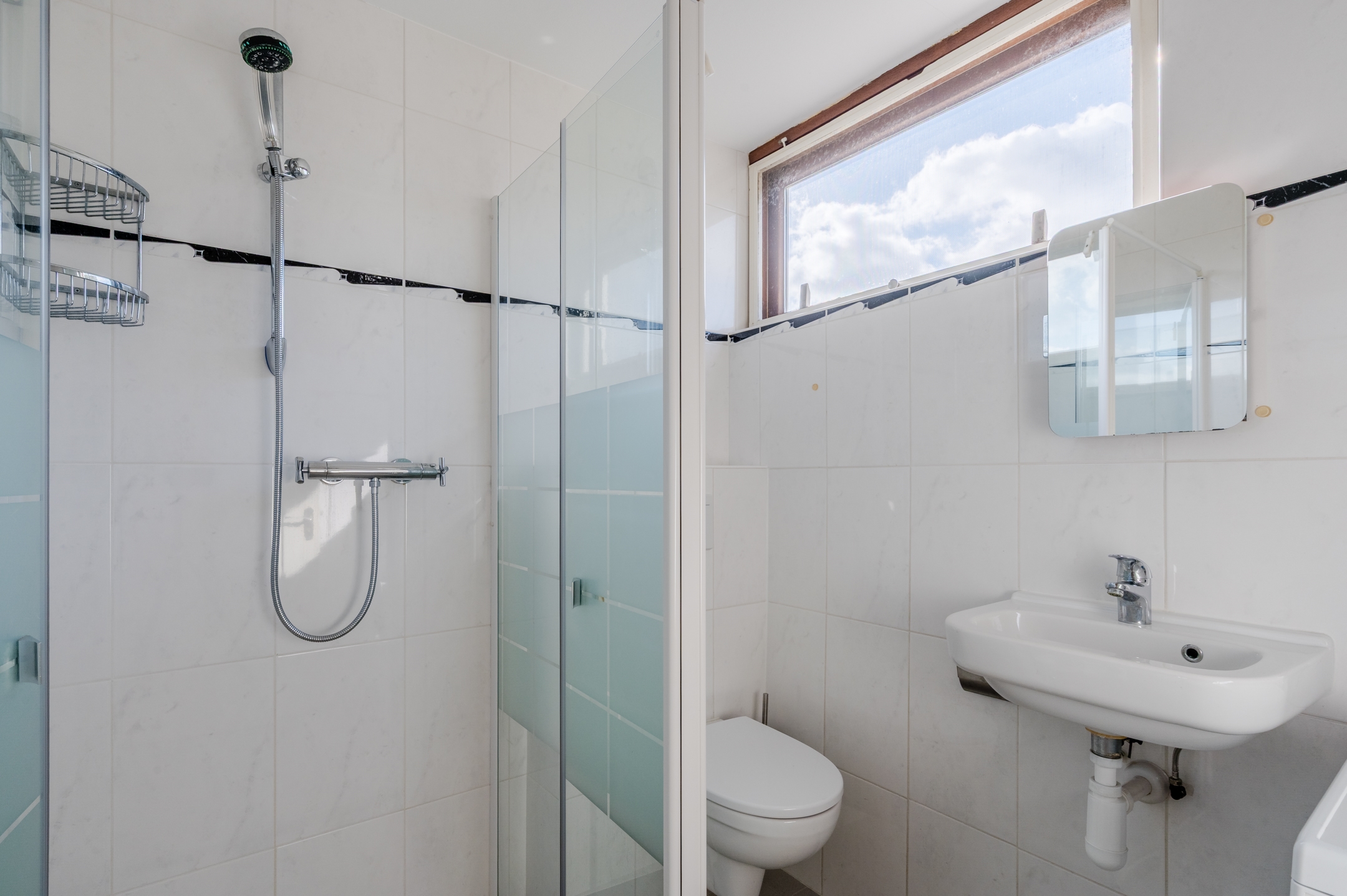 - Verzorgde badkamer met douche, zwevend toilet, wastafel en wasmachineaansluiting