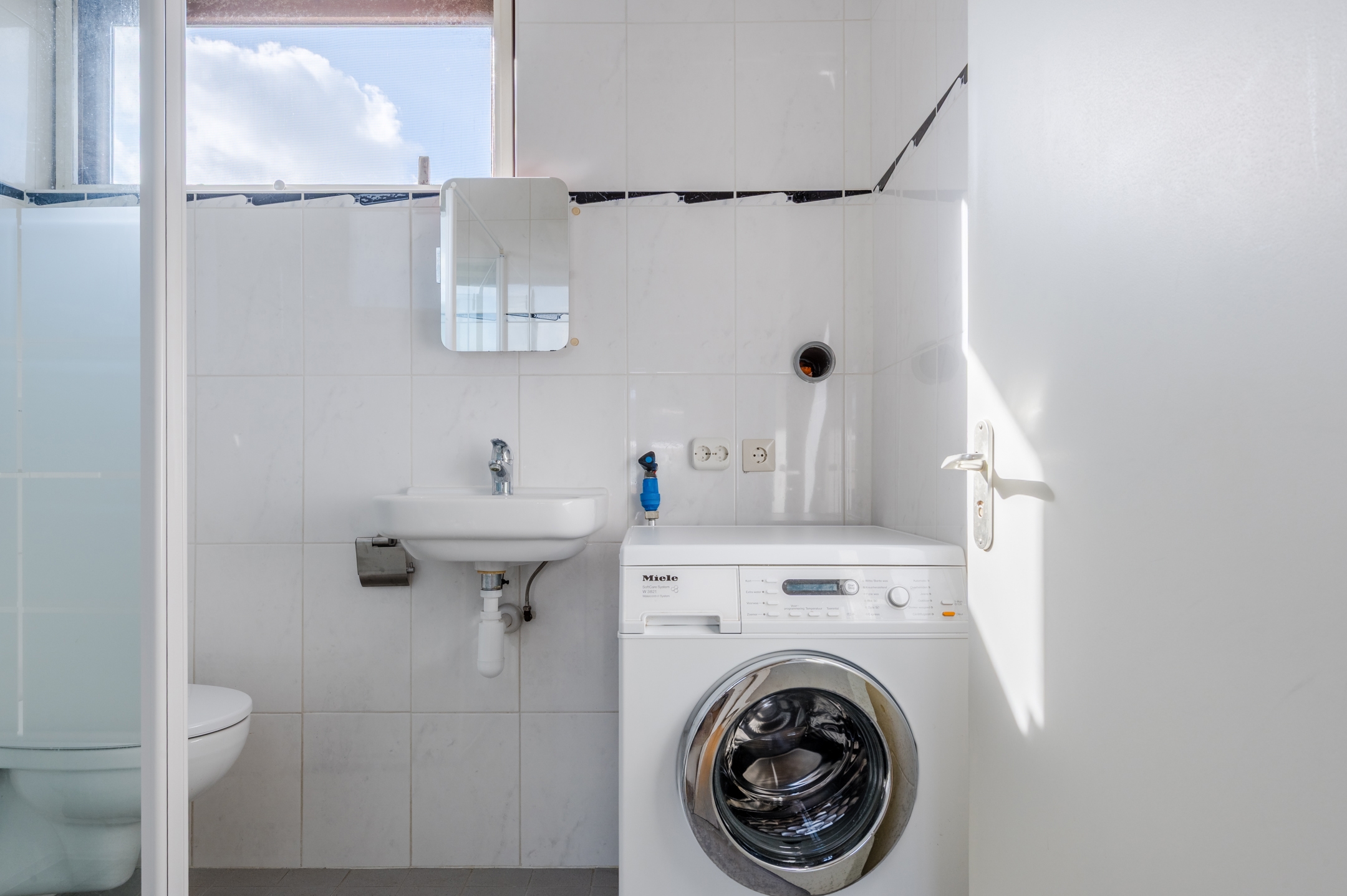 - Verzorgde badkamer met douche, zwevend toilet, wastafel en wasmachineaansluiting