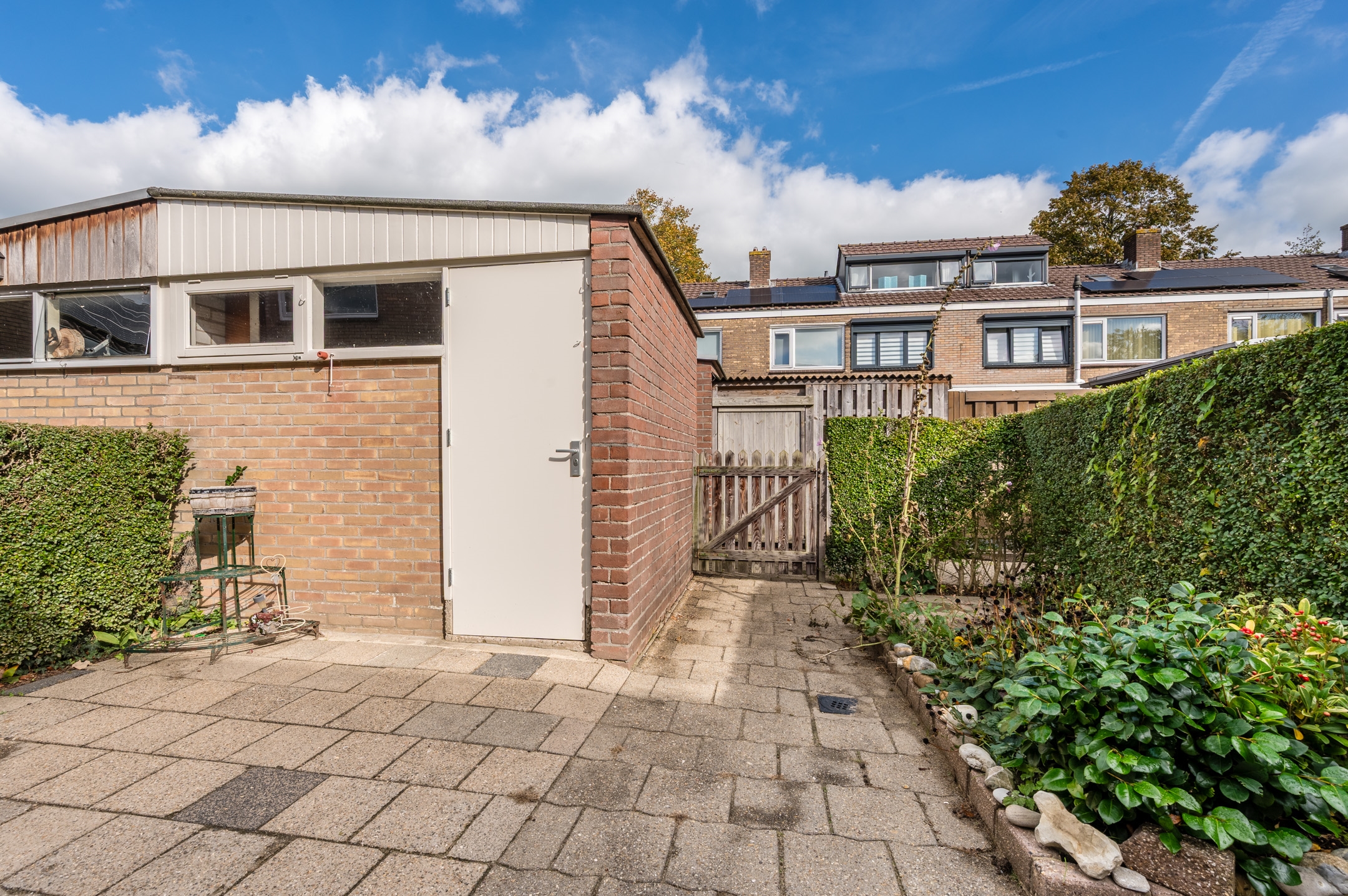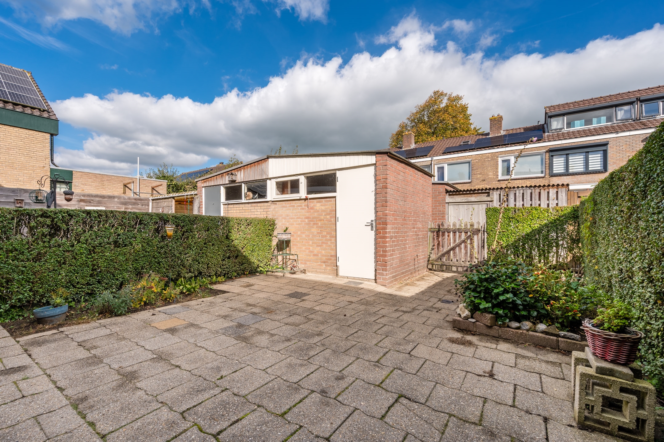 - Diepe achtertuin op het noordoosten met vrijstaande stenen berging en achterom