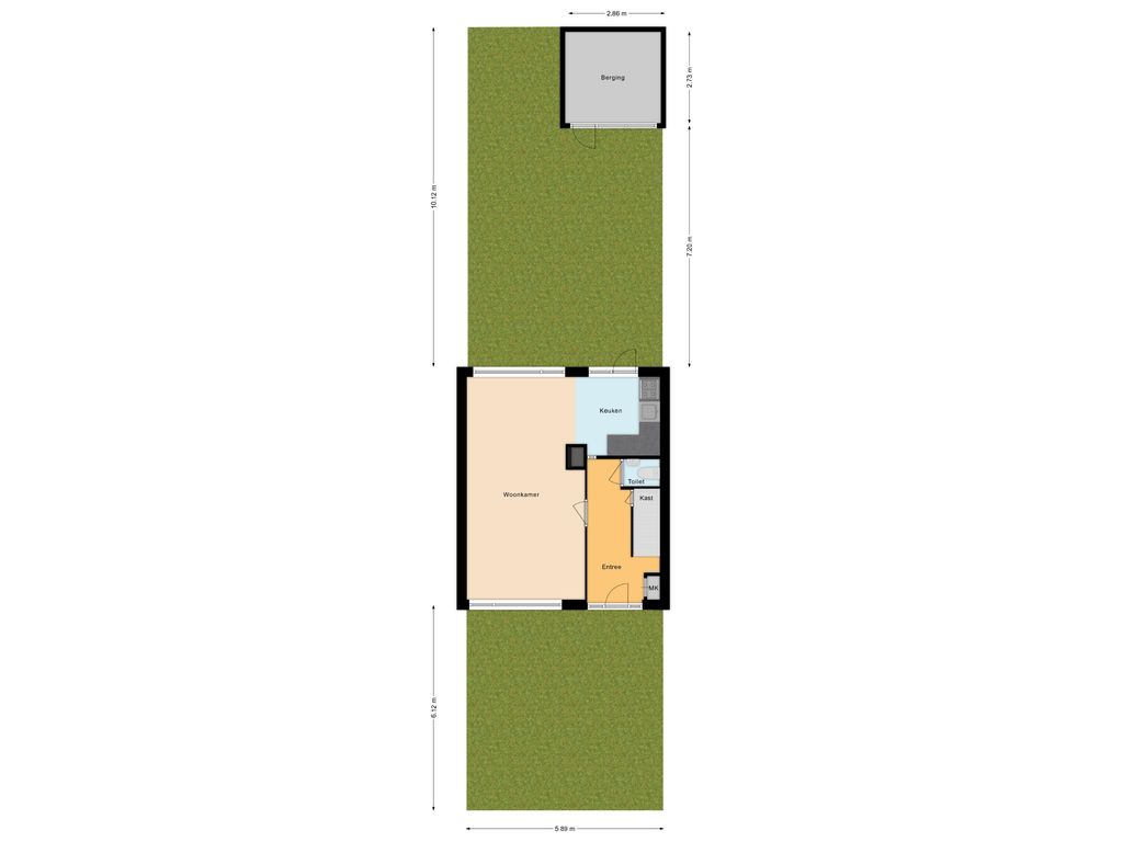• Diepe achtertuin op het noordoosten met vrijstaande stenen berging en achterom