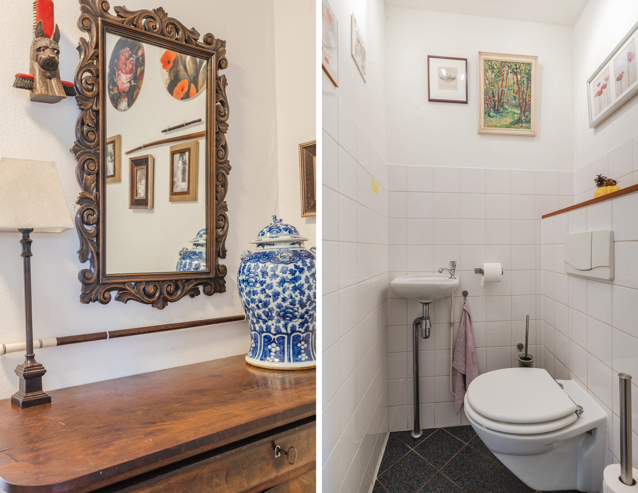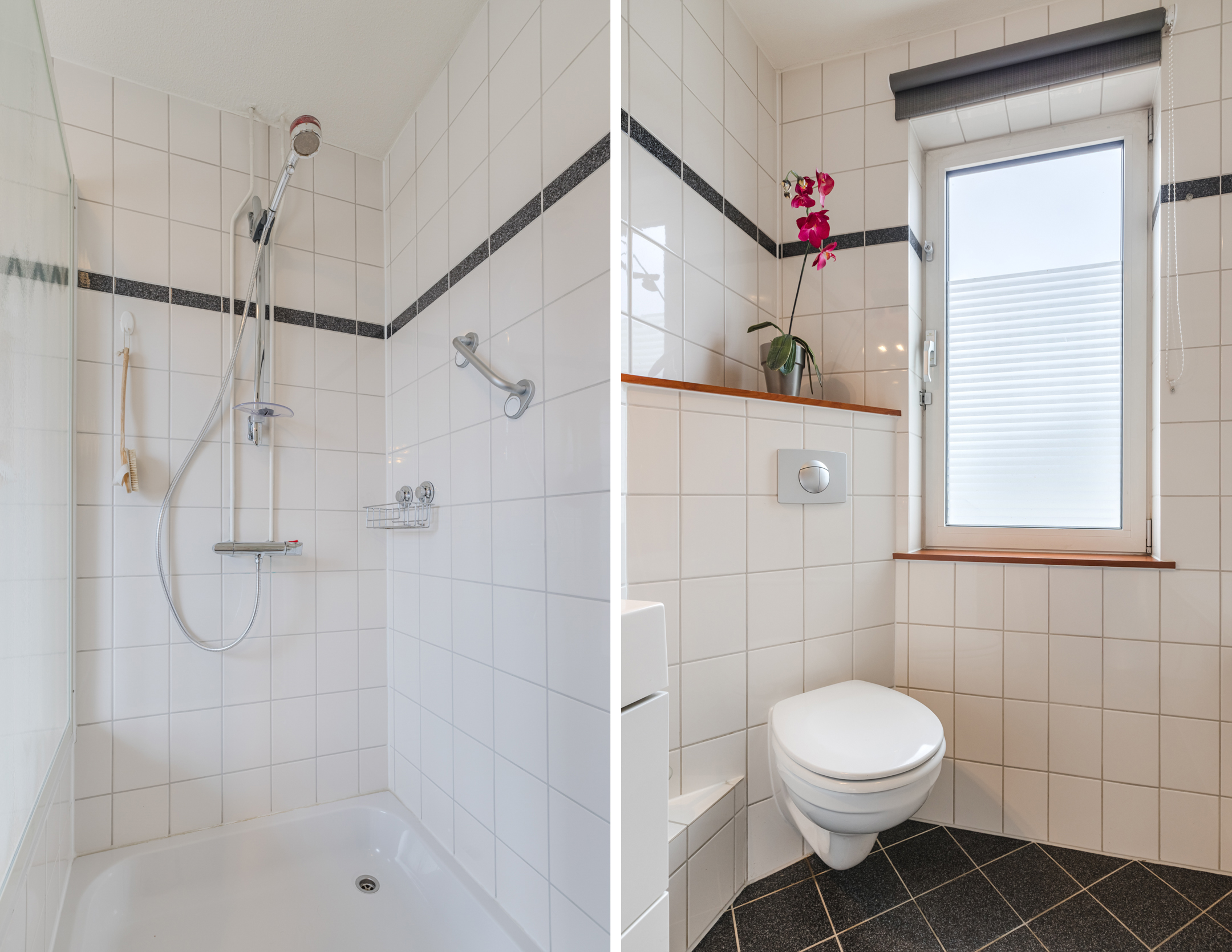 • Complete badkamer met ligbad, douchecabine, zwevend toilet en wastafelmeubel (naar eigen smaak te moderniseren)