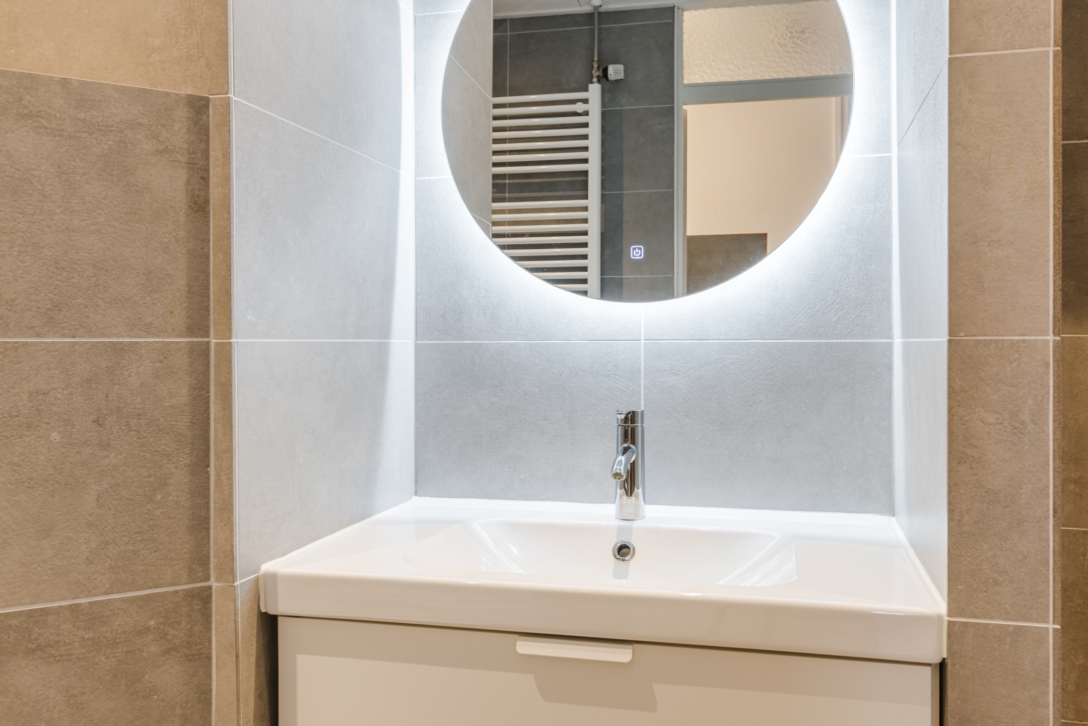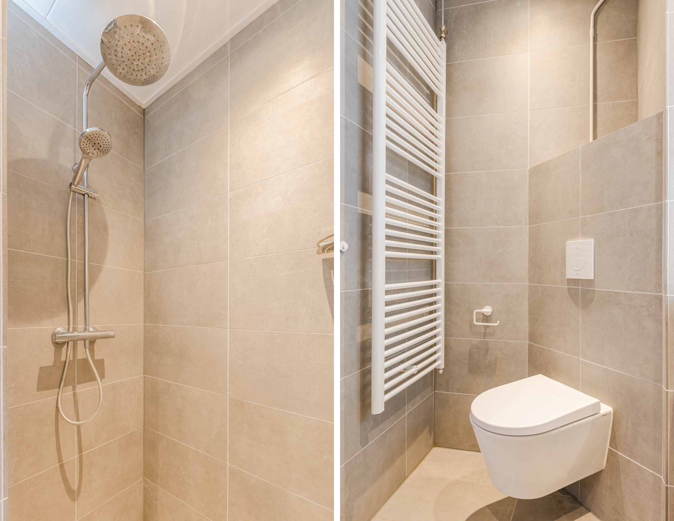 - Nieuw aangelegde, stijlvolle badkamer met inloopdouche, fraai wastafelmeubel met spiegel en zwevend toilet