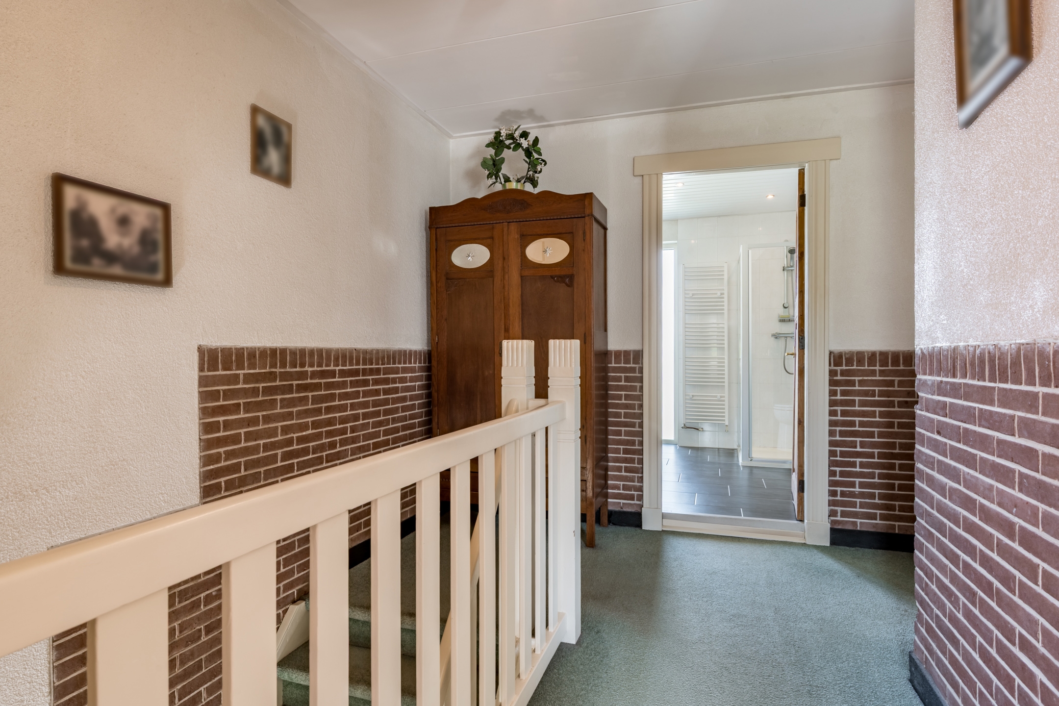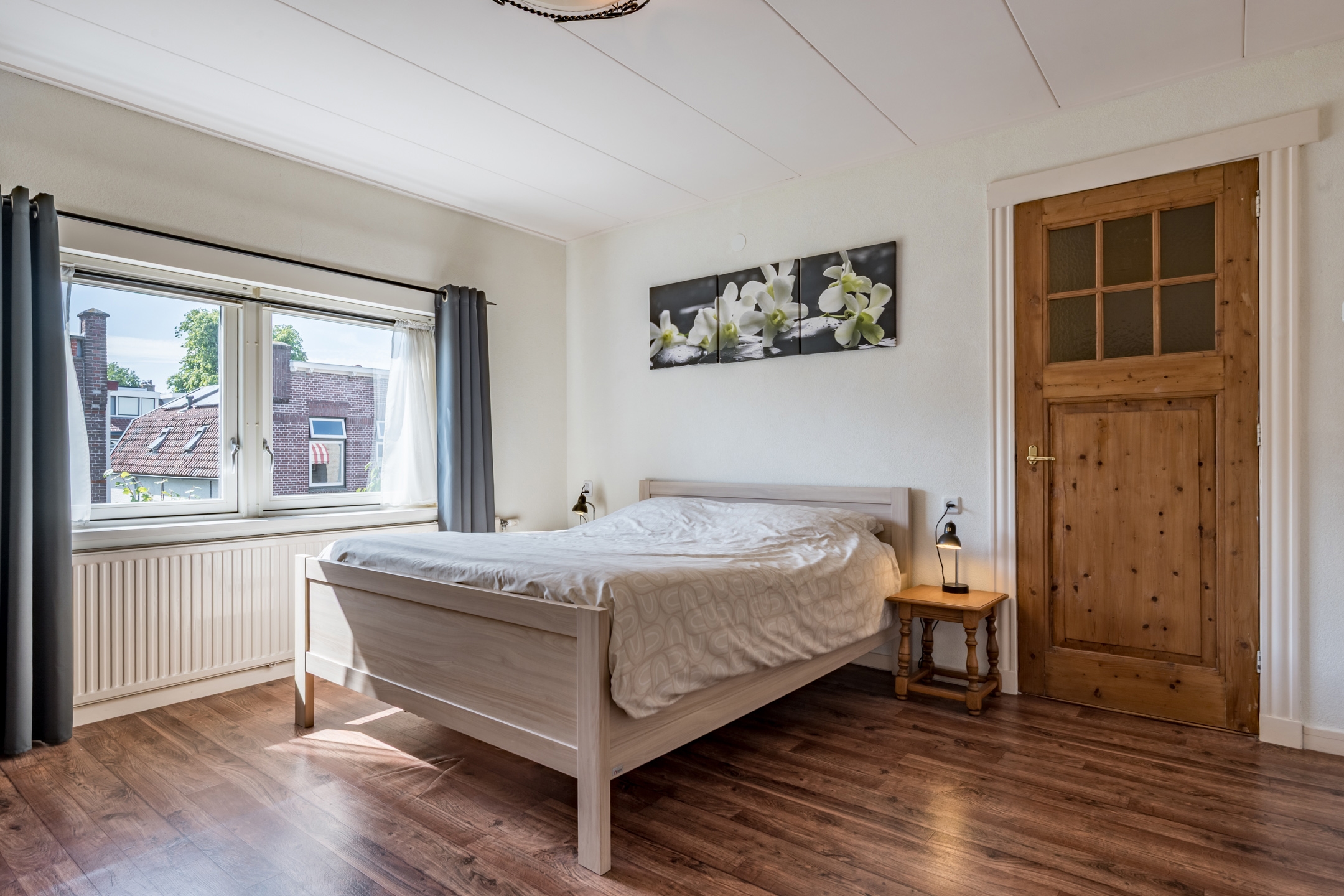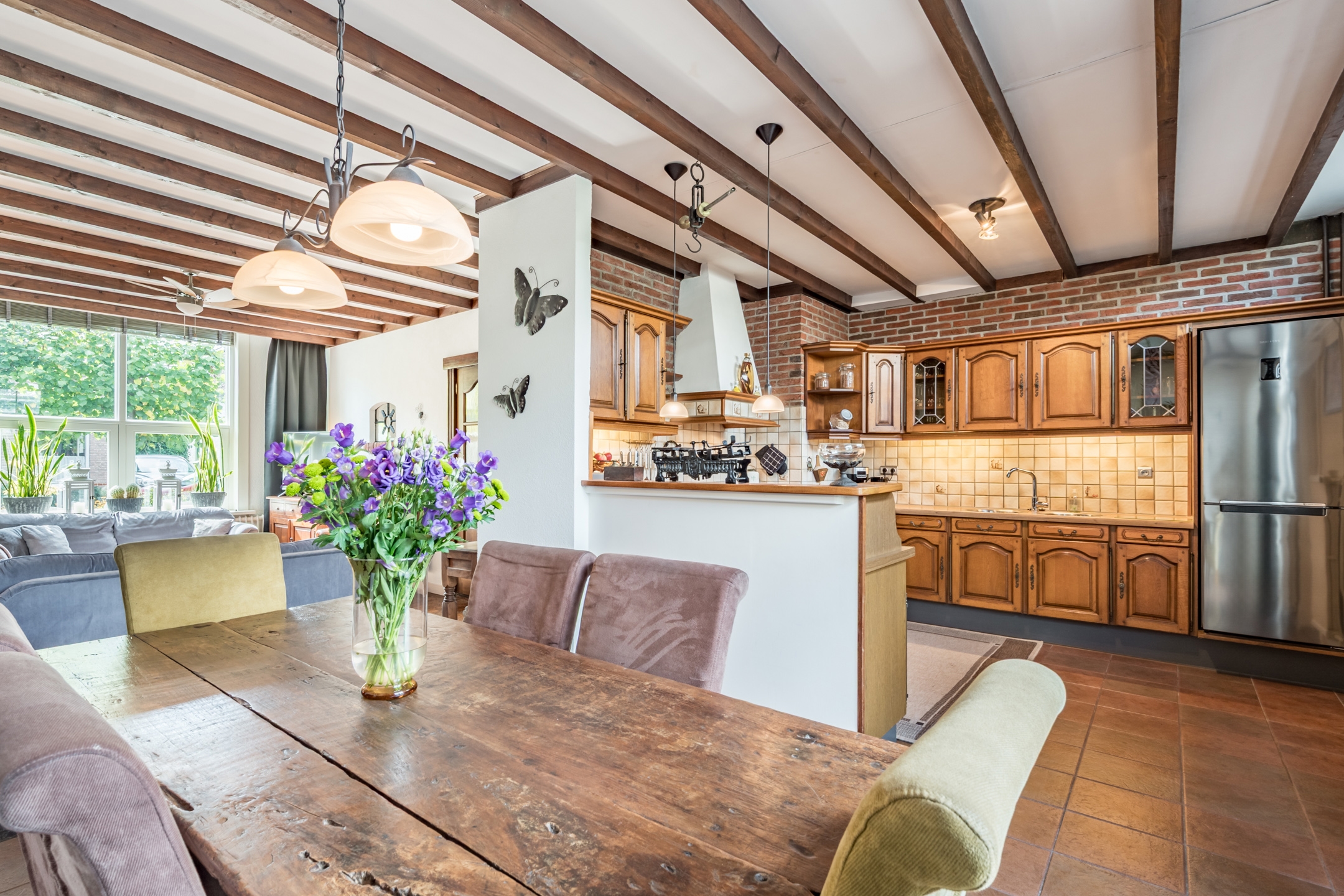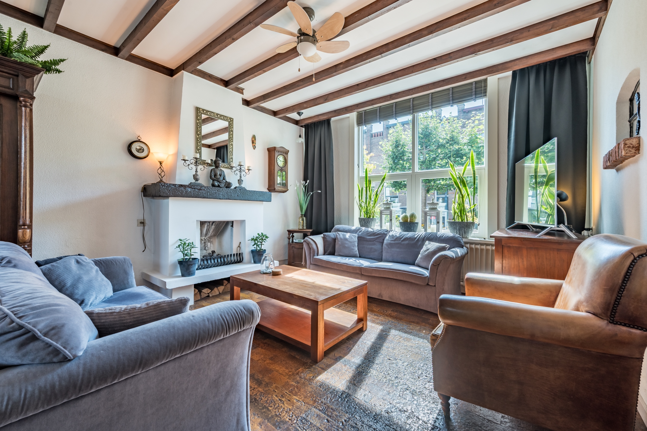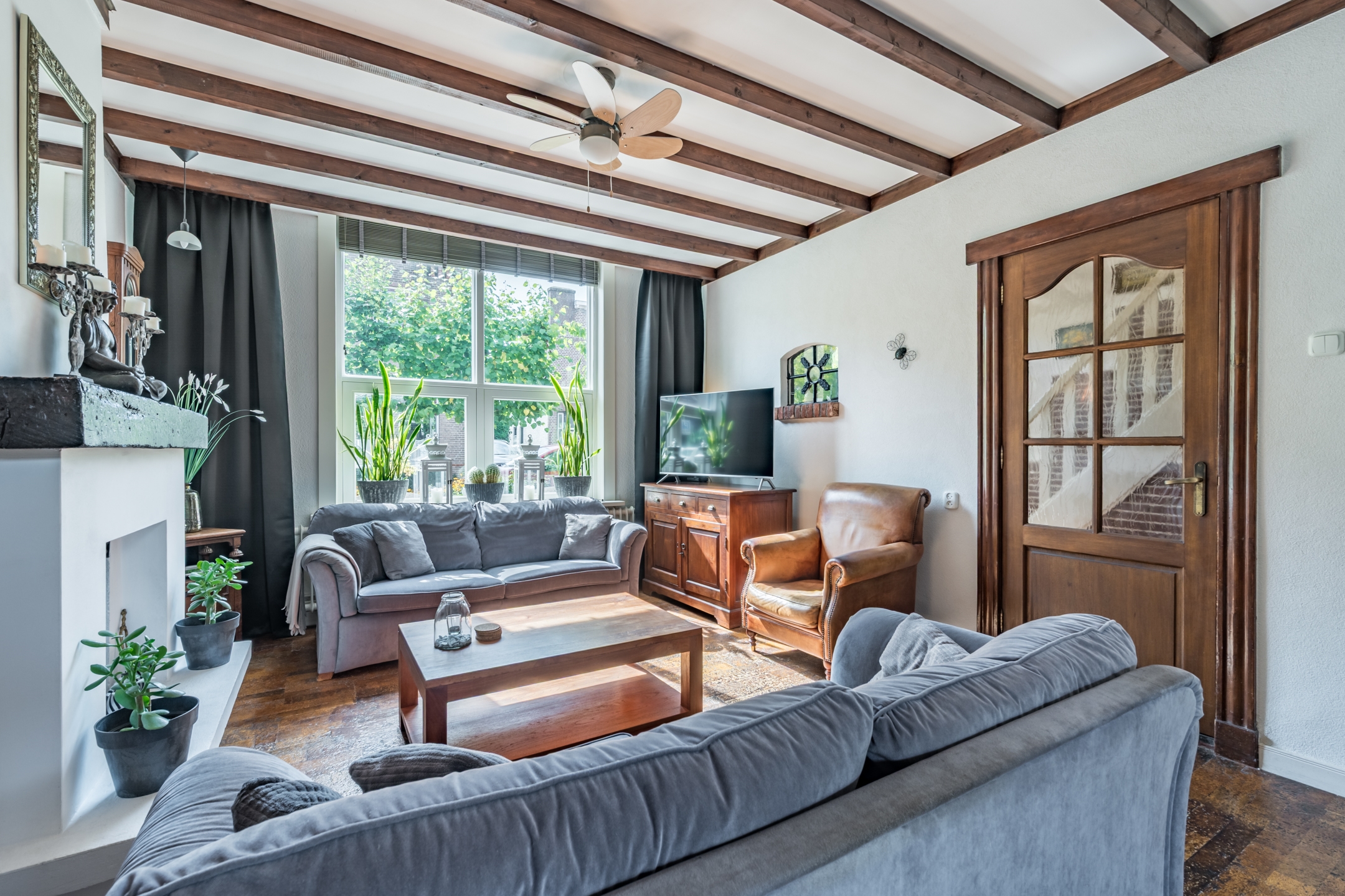 De woonkamer met sfeervolle balken en gashaard geeft een gevoel van thuiskomen, en de openslaande deuren leiden naar een verzorgde achtertuin met overkapping. De woning biedt lichte, ruime vertrekken en een praktische indeling met een grote keuken, bijkeuken, drie slaapkamers en een fijne badkamer. Gelegen in een rustige straat, maar toch dichtbij station en centrum – hier combineer je rust en gemak moeiteloos.