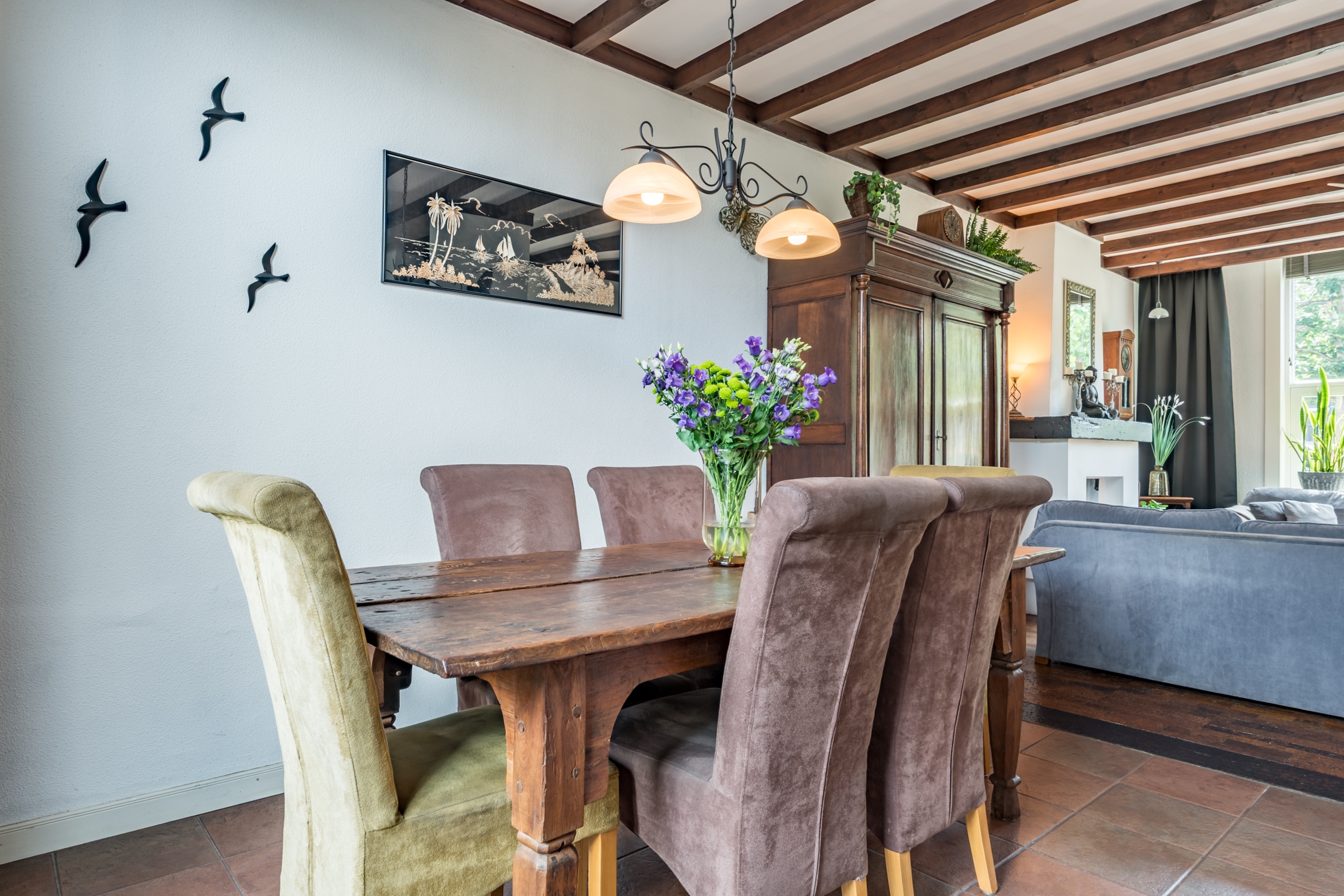 - Sfeervolle woonkamer met karakteristieke balken, een knusse gashaard met schouw en openslaande deuren naar de tuin