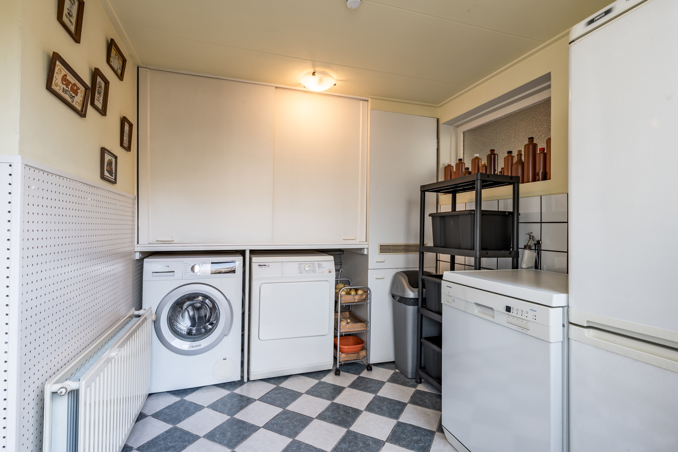 - Praktische keuken in U-opstelling met volop ruimte en aansluitend een royale bijkeuken met veel bergruimte en plek voor wasmachine en droger