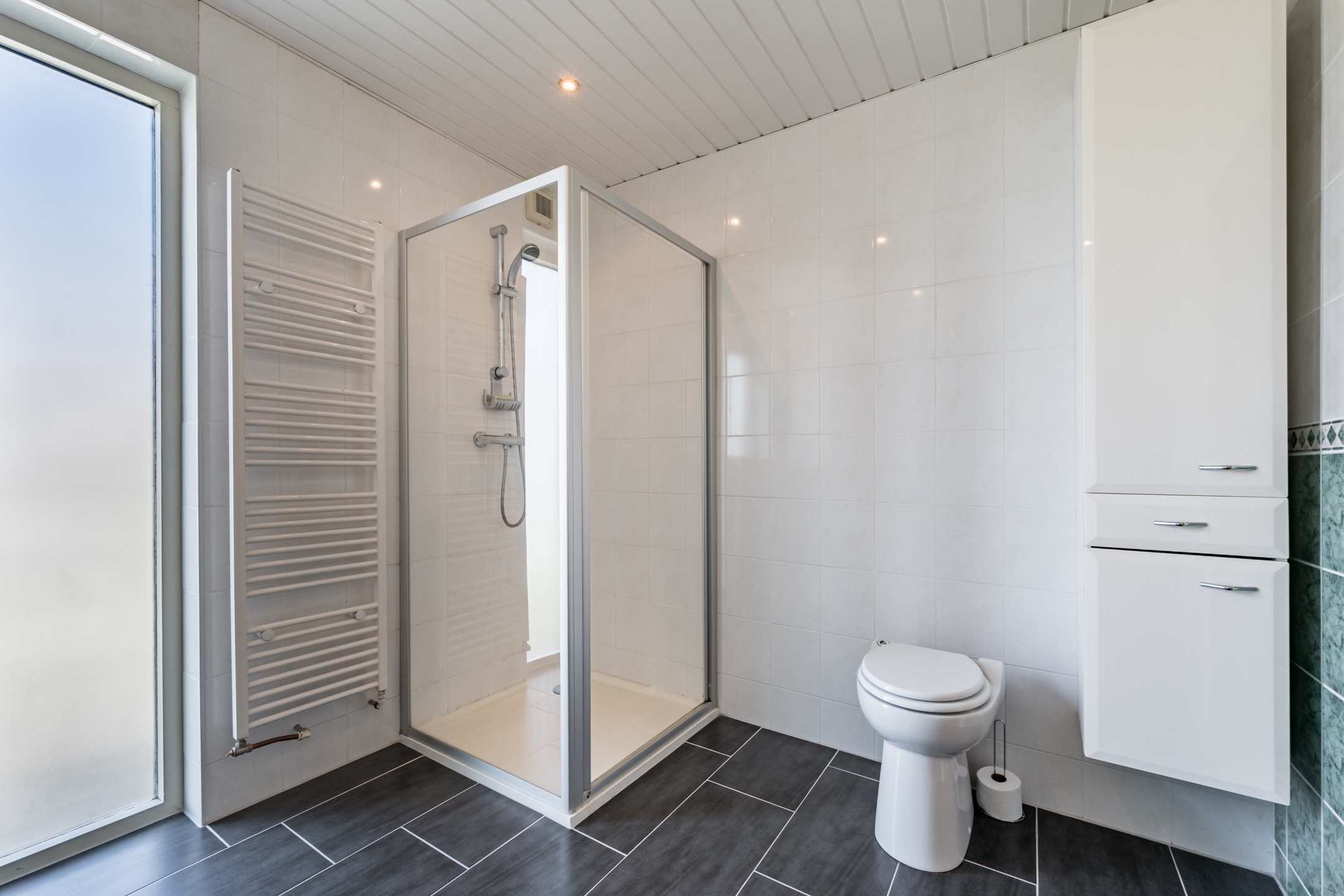 - Lichte en royale badkamer met douche, dubbele wastafel, toilet én vloerverwarming