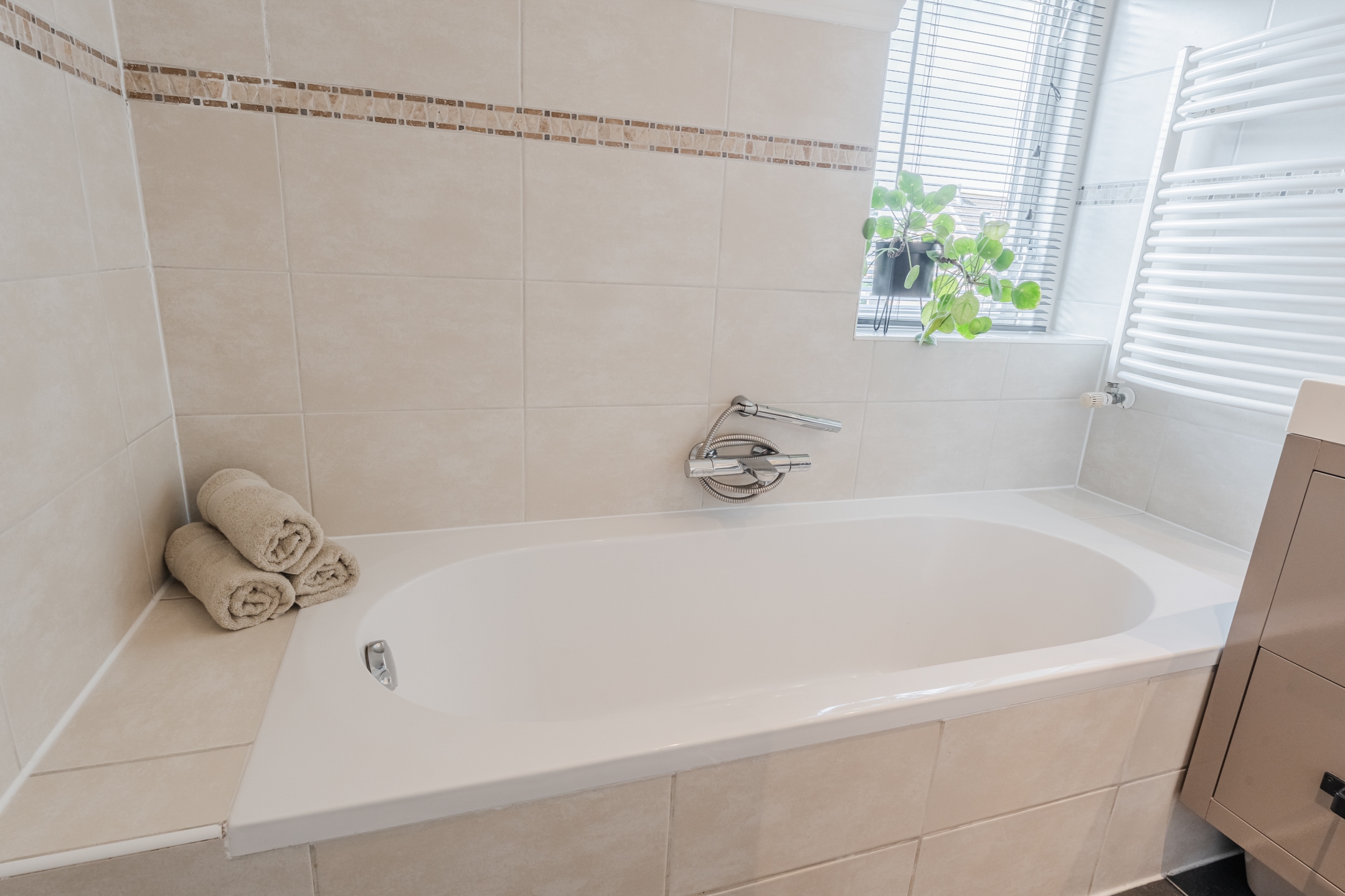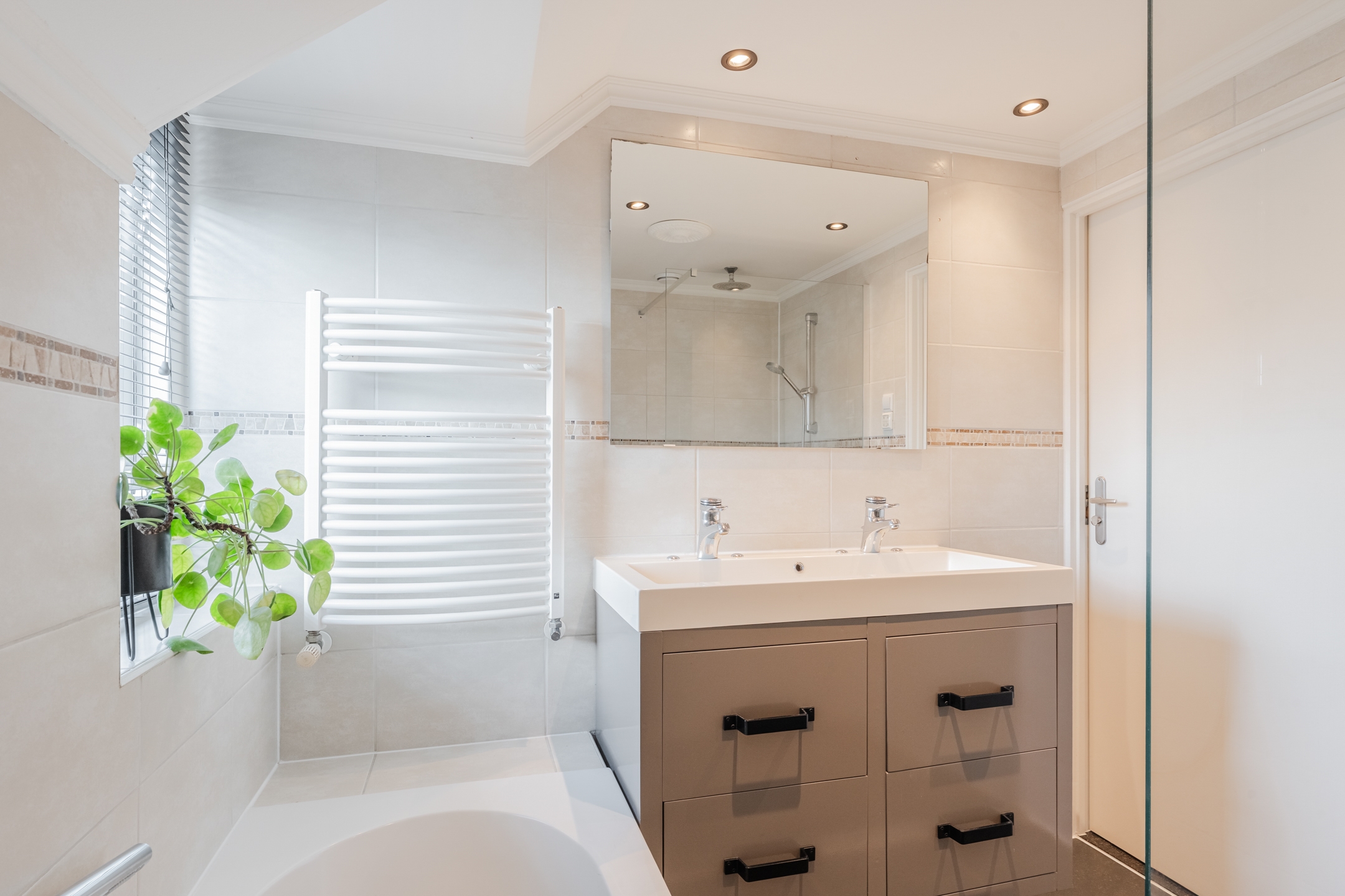 - Moderne badkamer met ligbad, inloopdouche en dubbele wastafel