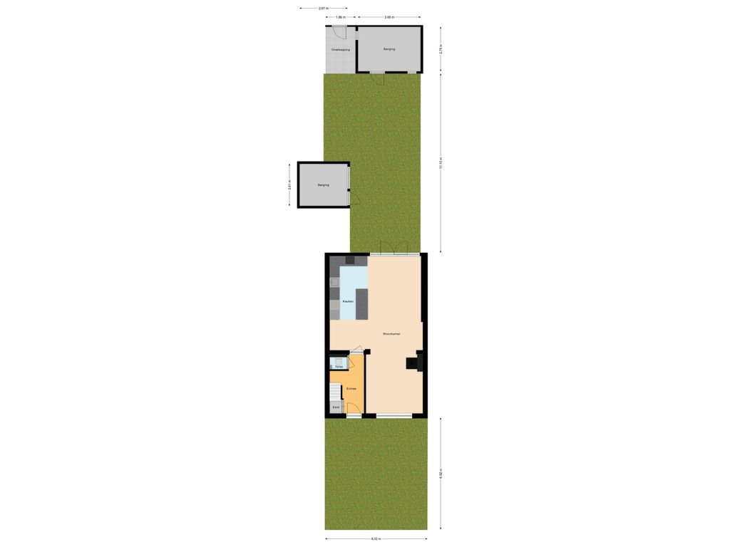 Disclaimer: Conform de officiële rekenmethodiek valt het bijgebouw/werkruimte onder de categorie 'externe bergruimte'. In dit geval is ervoor gekozen het bijgebouw/werkruimte mee te rekenen als onderdeel van het woonoppervlak, aangezien deze naar ons oordeel in functioneel opzicht hierbij aansluit.