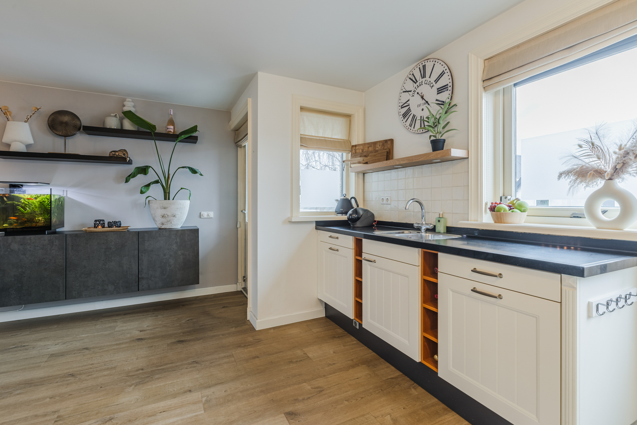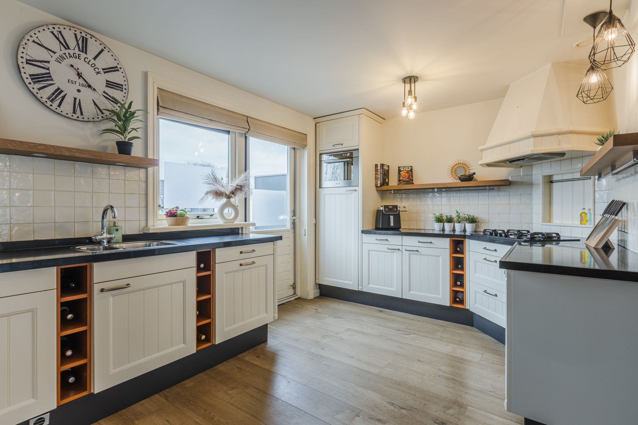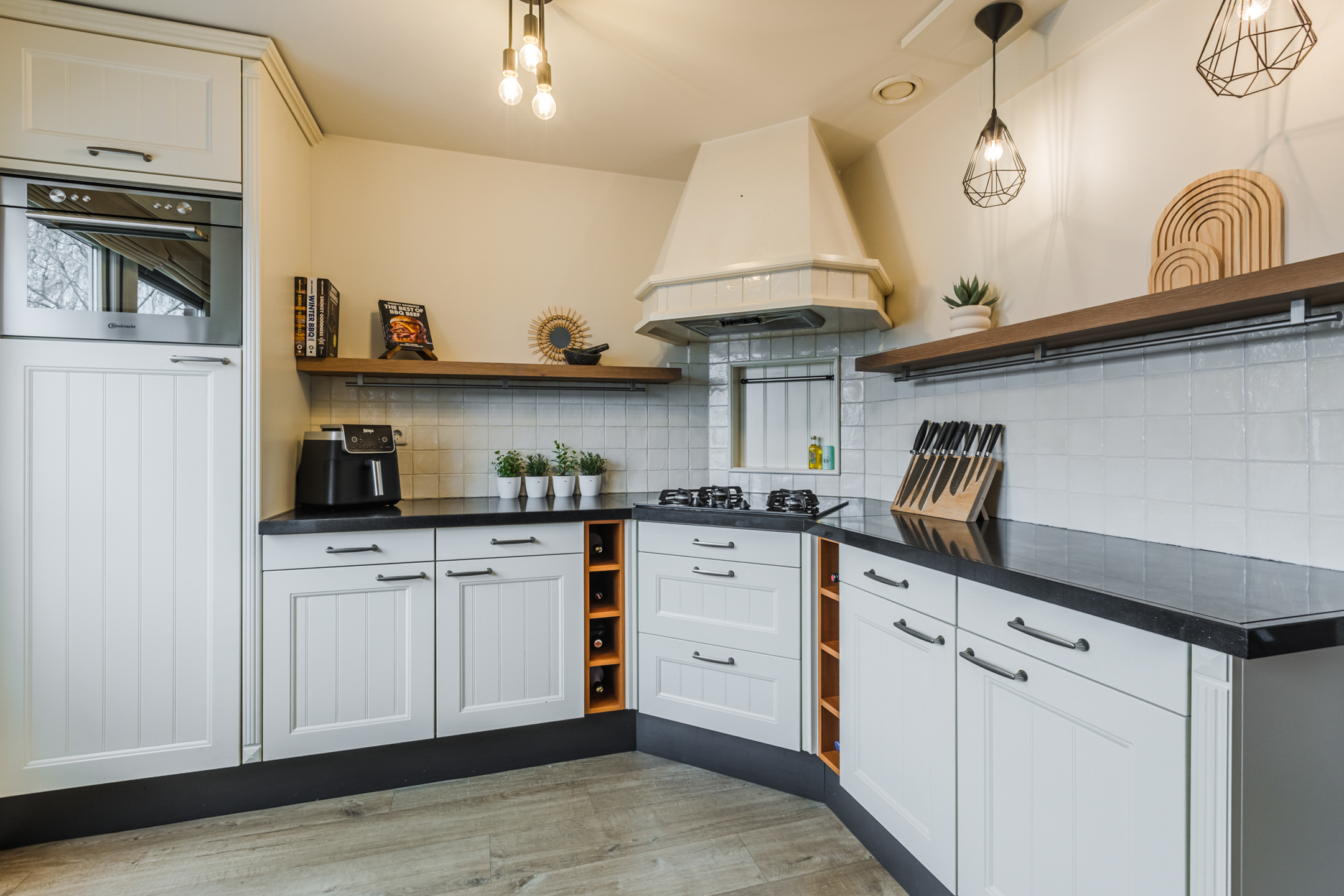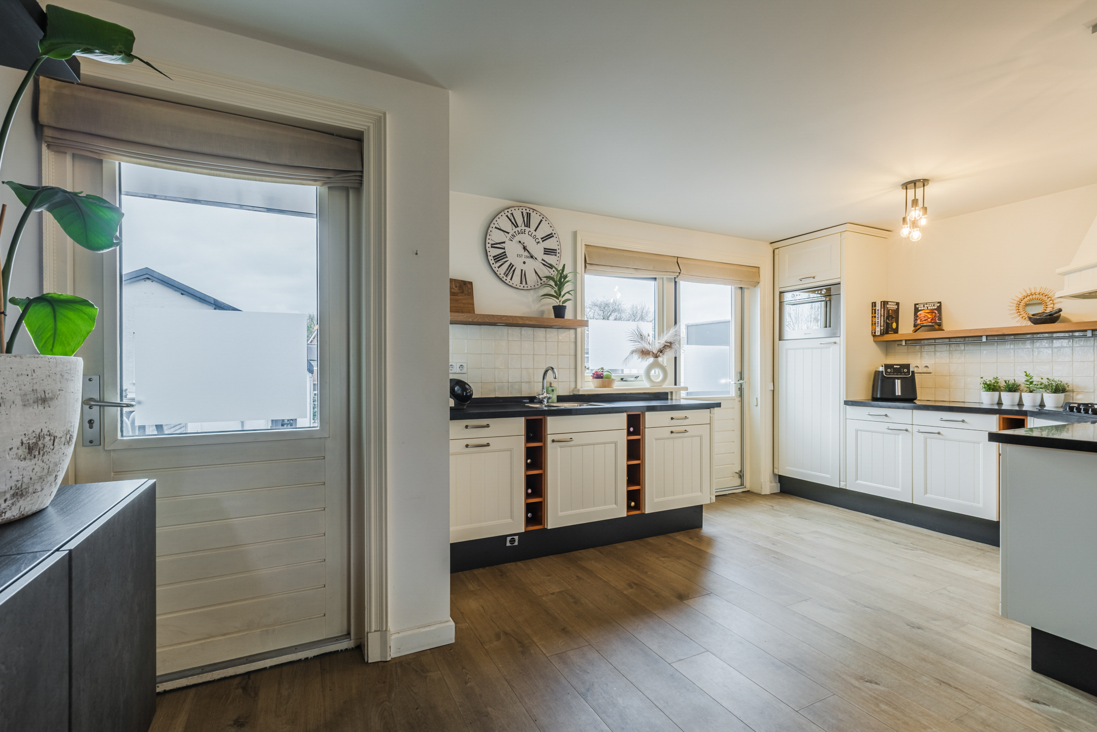• Riante keuken met landelijke uitstraling, voorzien van diverse inbouwapparatuur, volop kastruimte én toegang tot het balkon