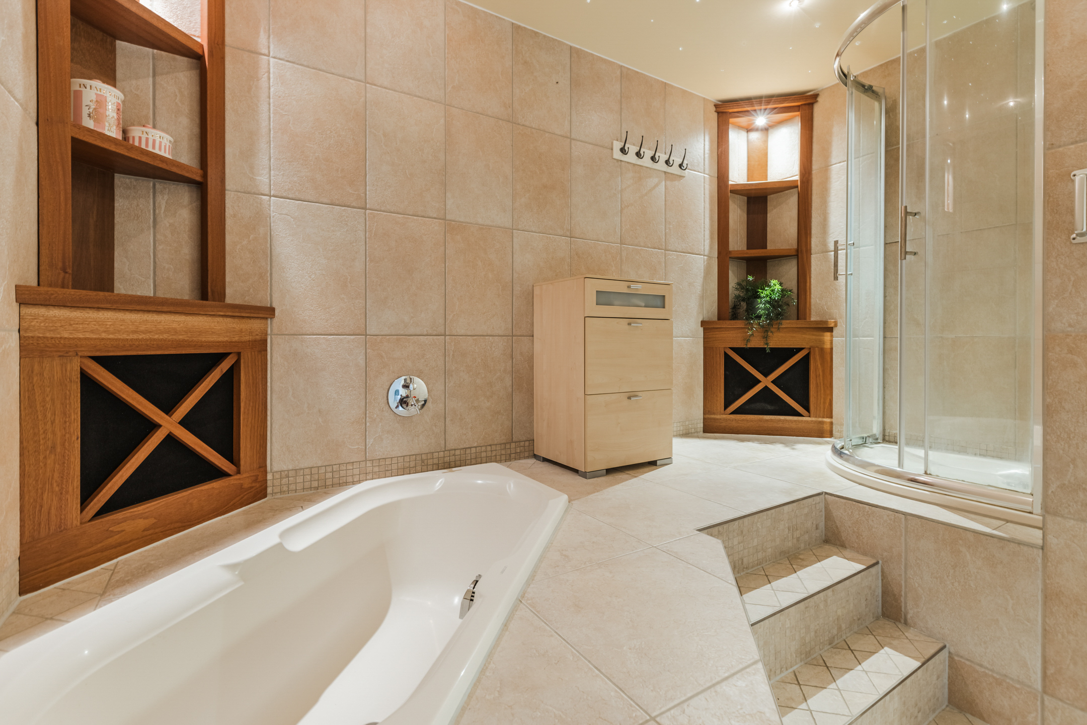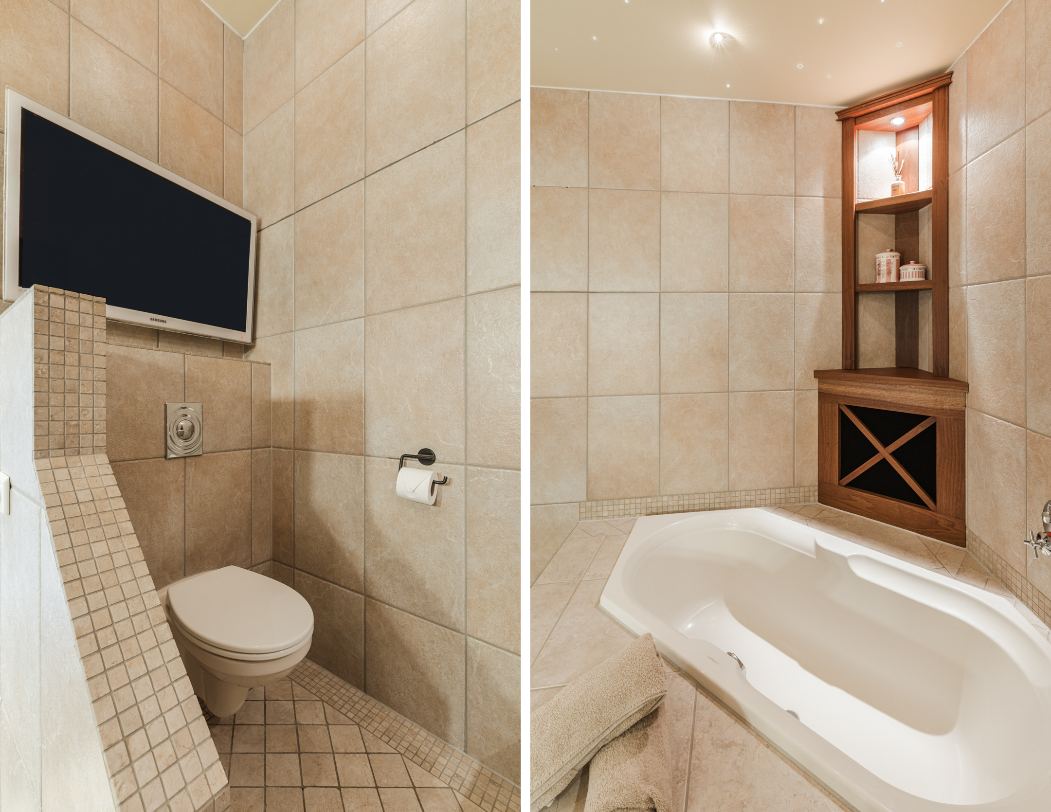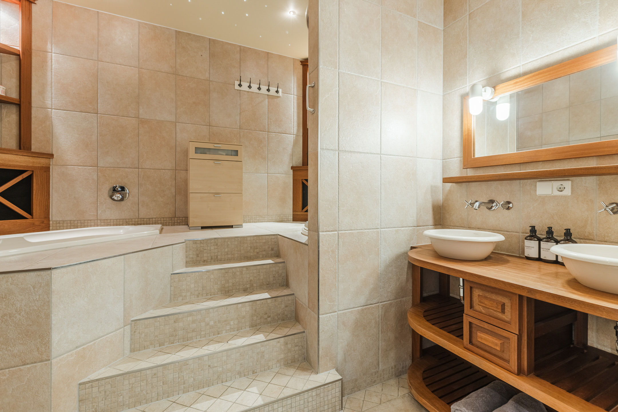 • Luxe badkamer in wellness-stijl met ligbad, douche, dubbel wastafelmeubel en een zwevend toilet