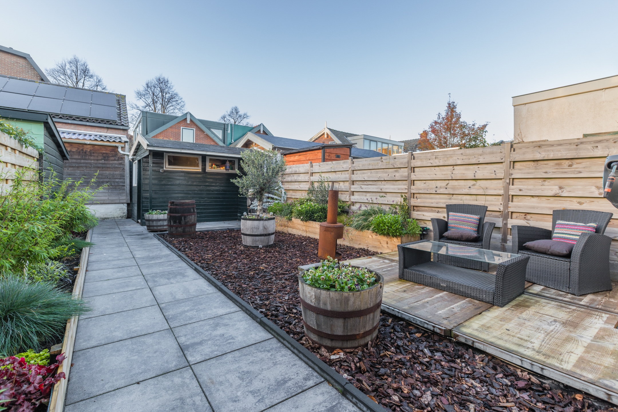 • Heerlijk diepe, zonnige achtertuin op het westen, strak aangelegd, achterom bereikbaar en ideaal om lange zomeravonden door te brengen