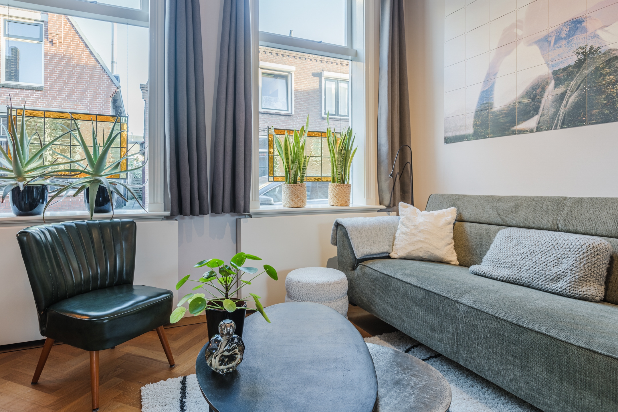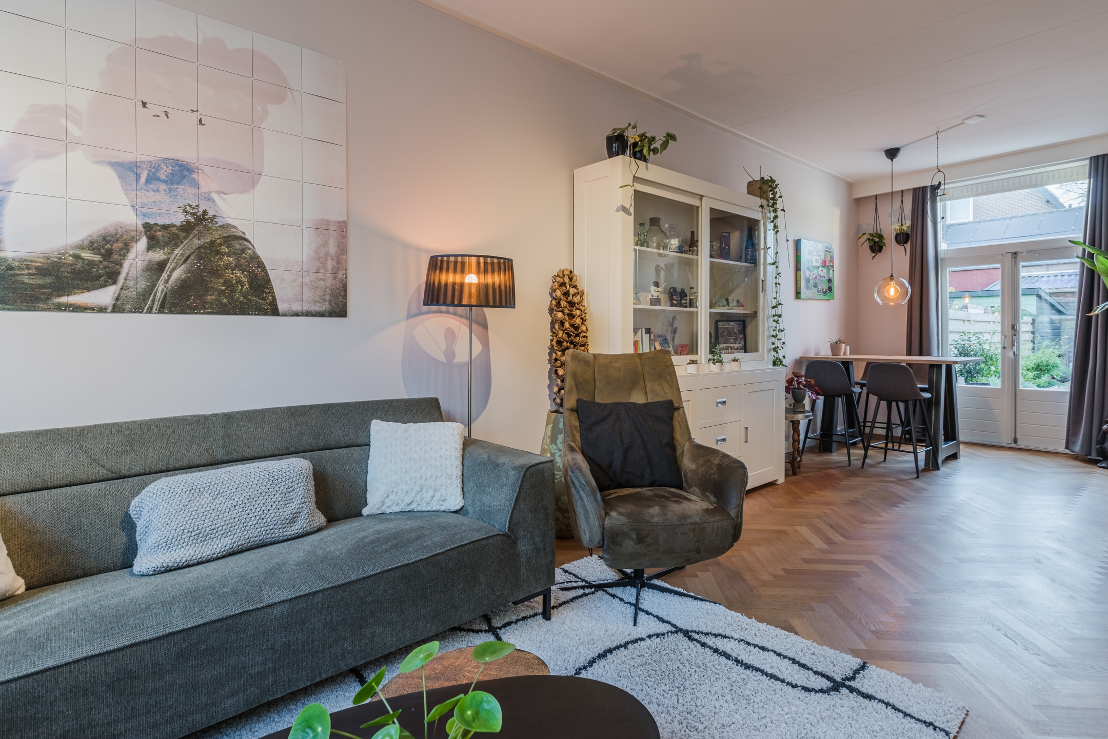 • Sfeervolle, lichte woonkamer waar het daglicht rijk binnenvalt via de openslaande deuren naar de tuin, compleet met een elegante visgraat parketvloer