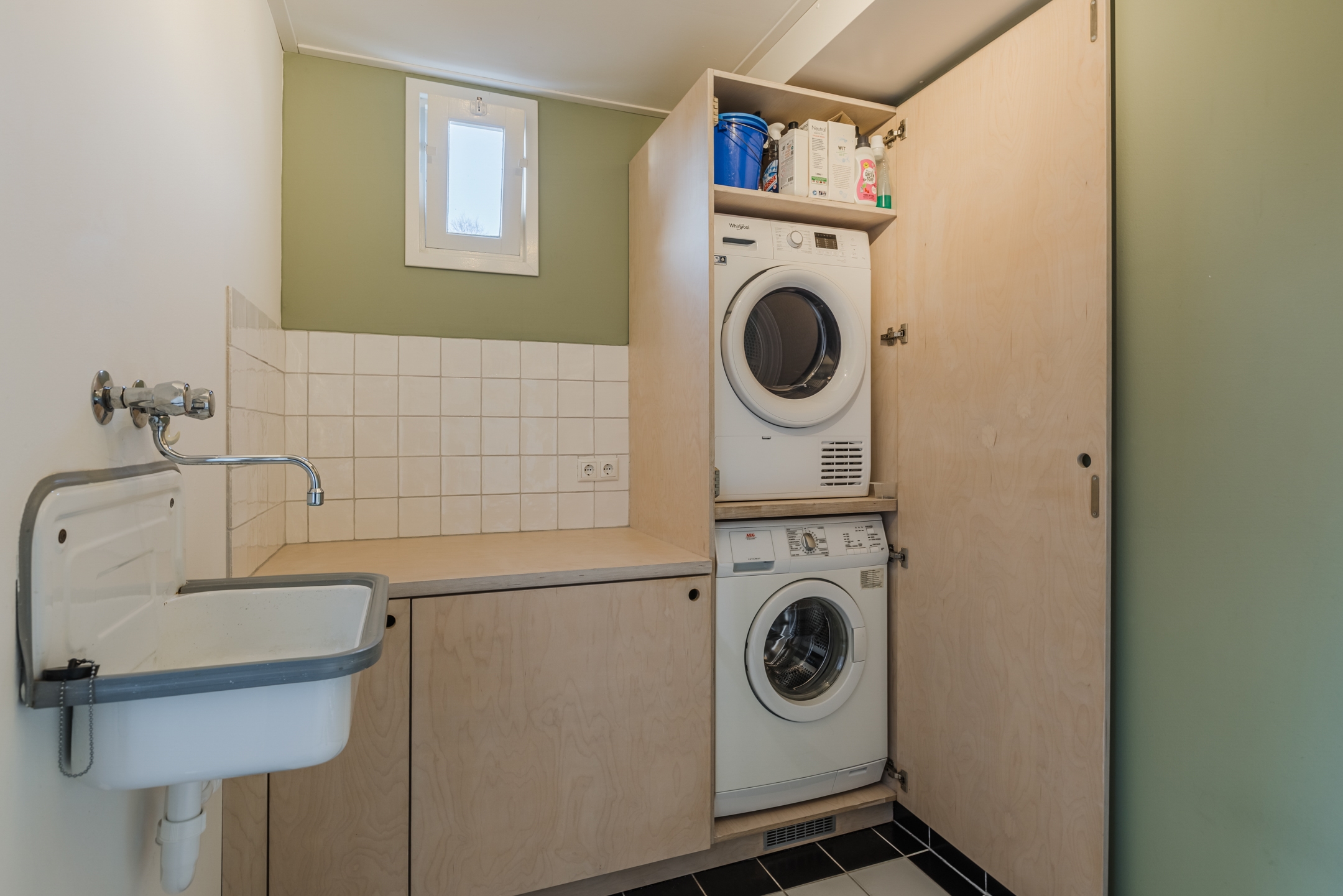 • Praktische, ruime bijkeuken met strak ontworpen, handgemaakte kasten voor wasmachine en droger
