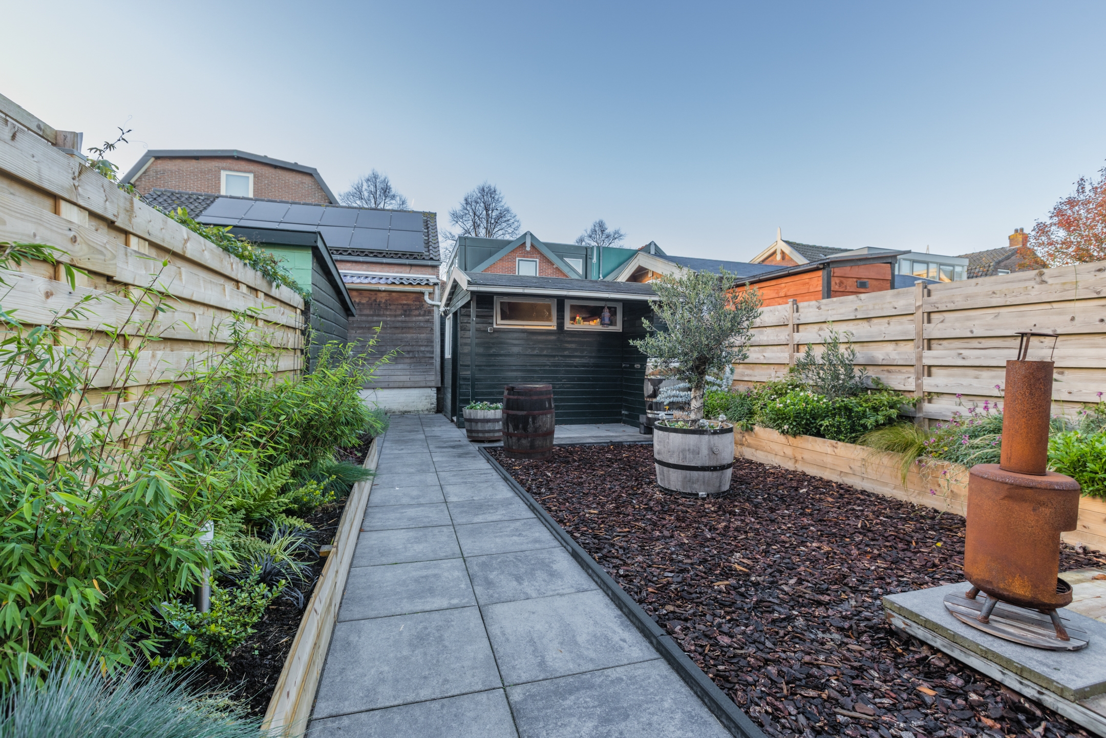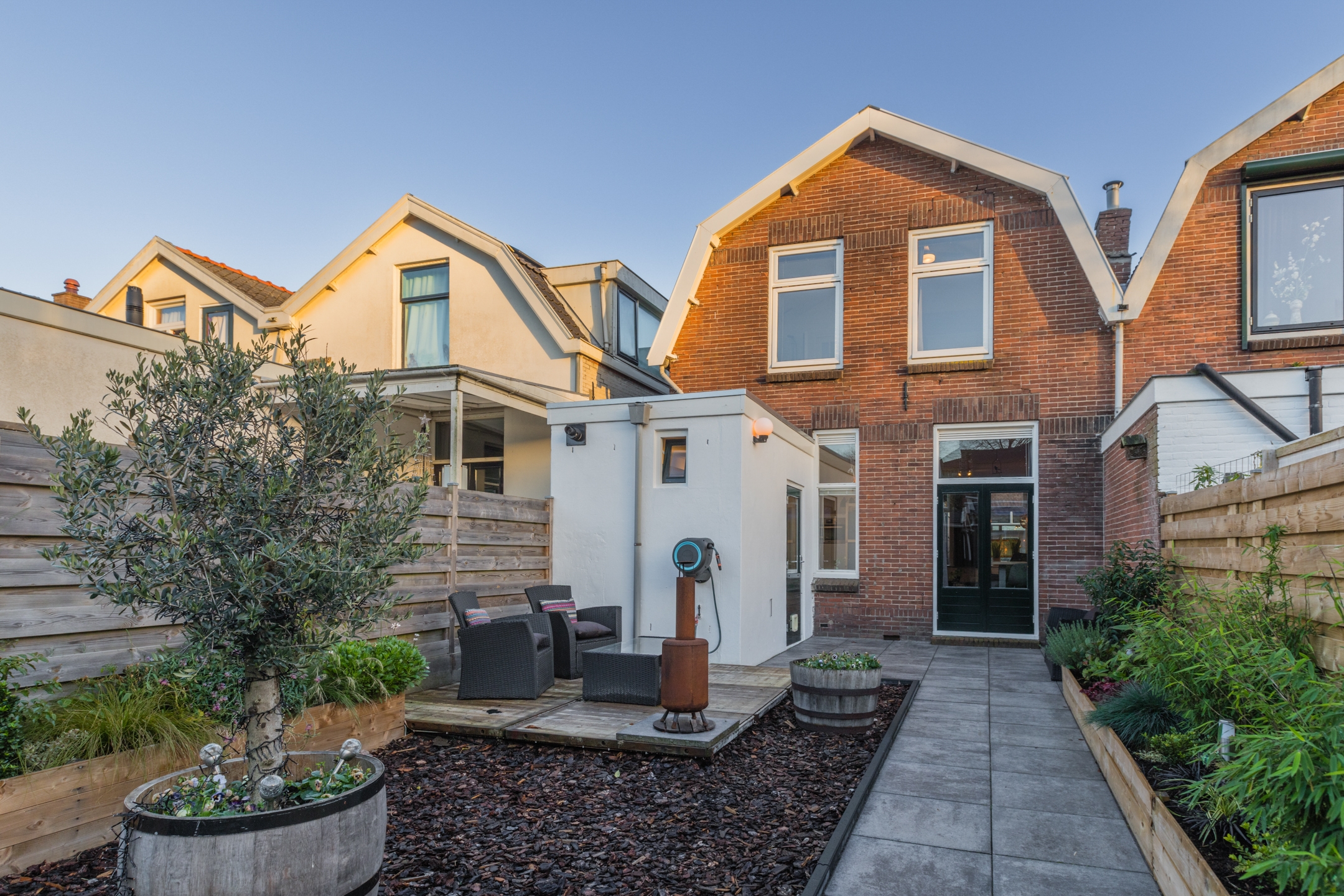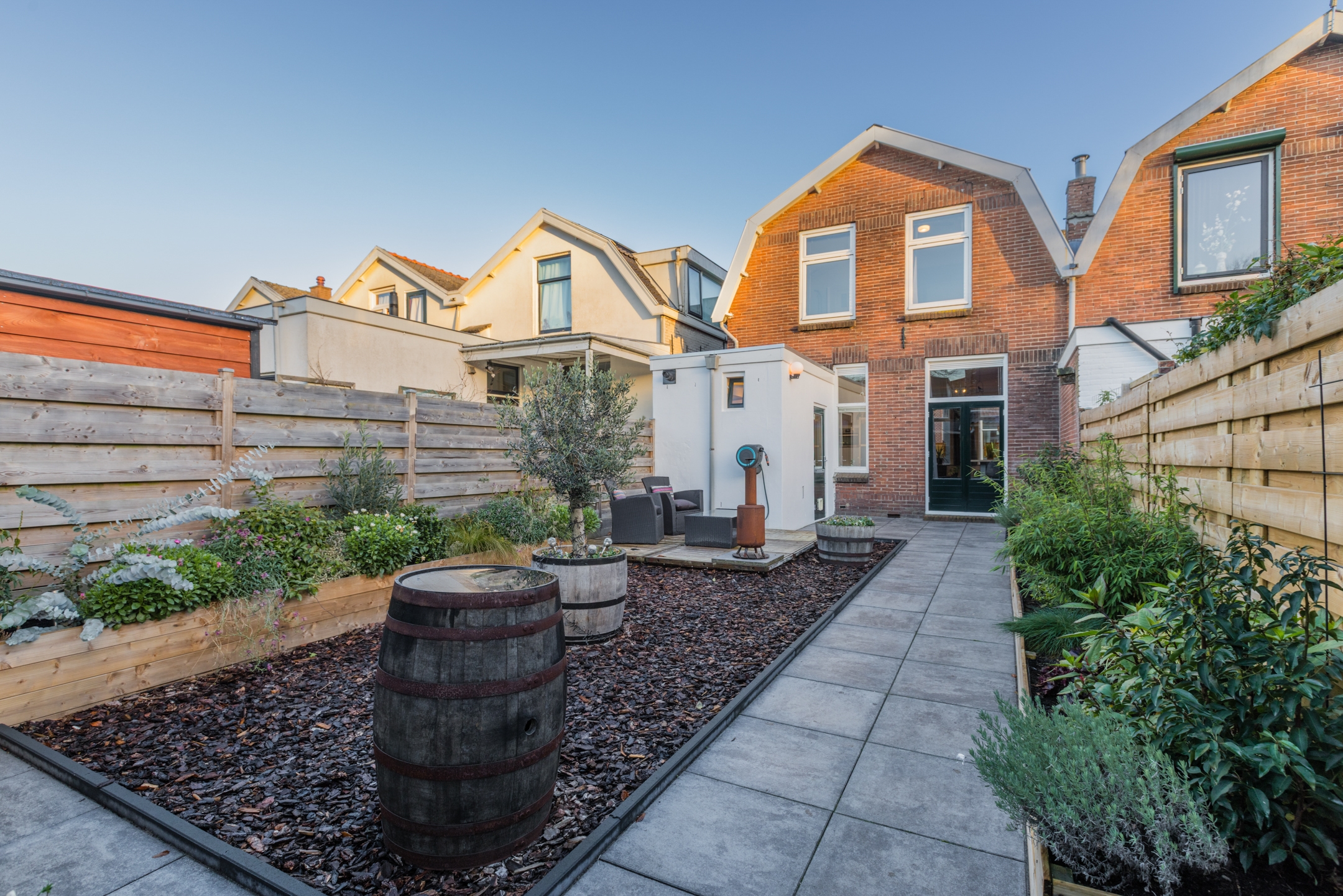 • Heerlijk diepe, zonnige achtertuin op het westen, strak aangelegd, achterom bereikbaar en ideaal om lange zomeravonden door te brengen