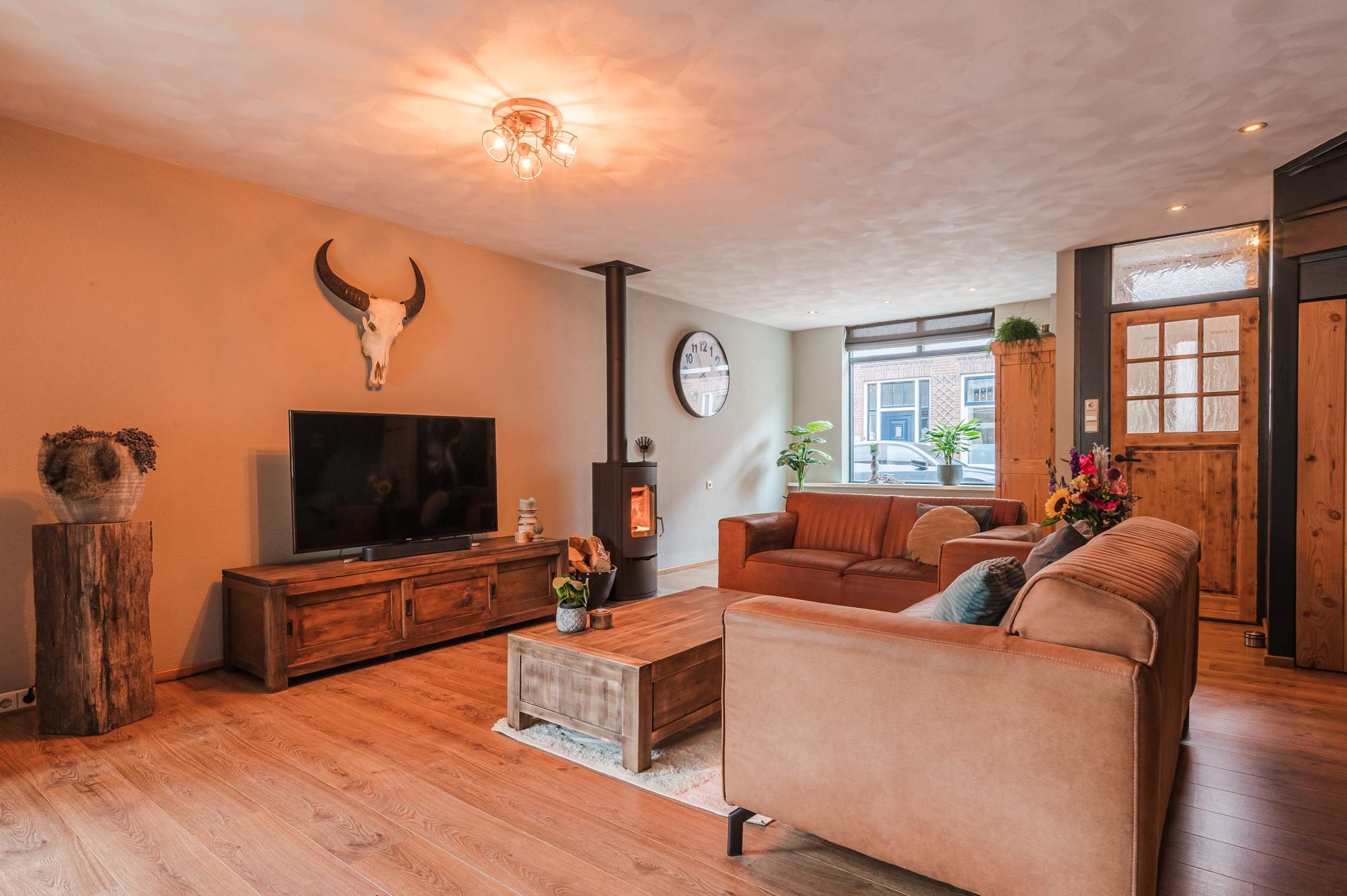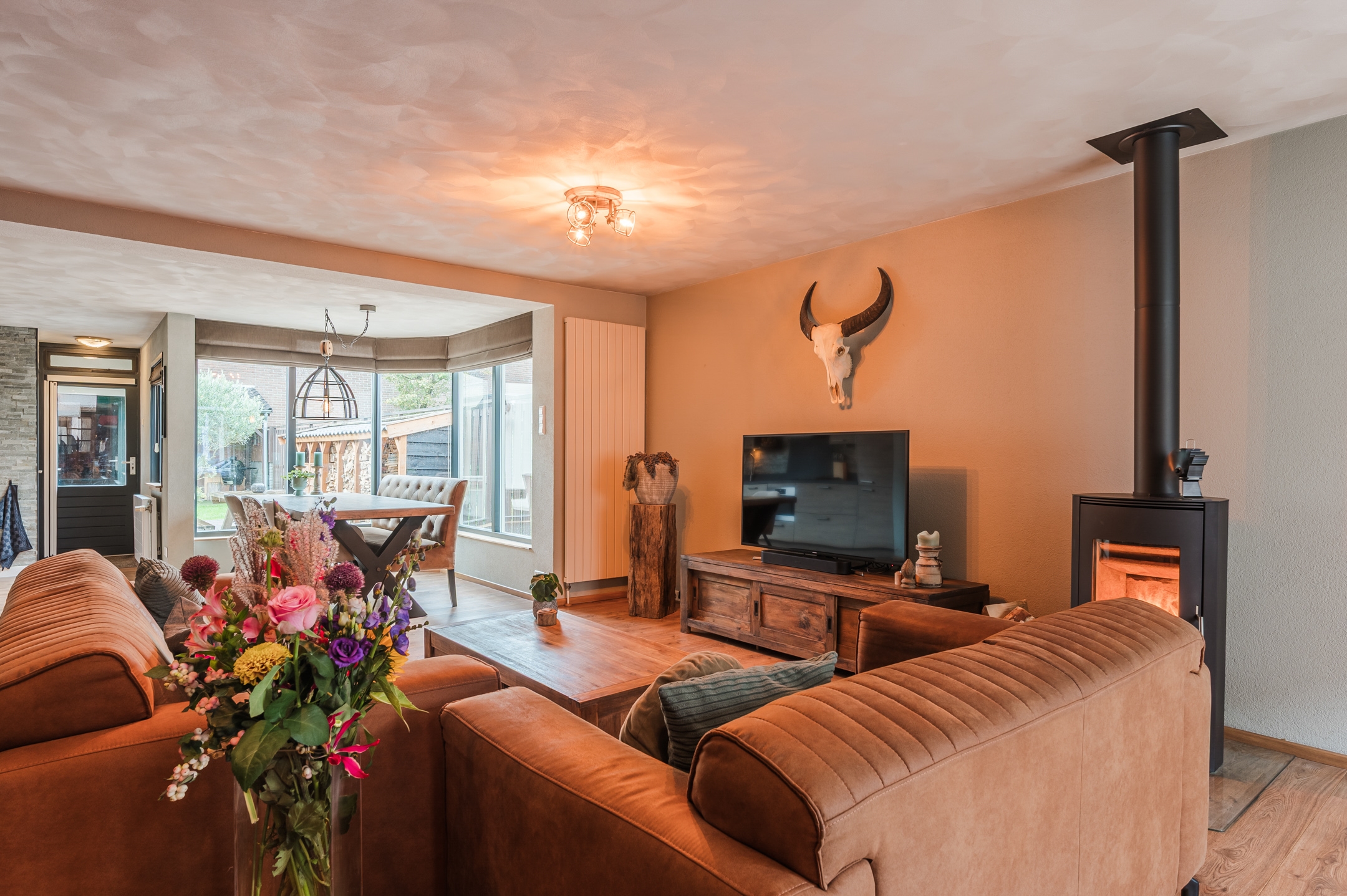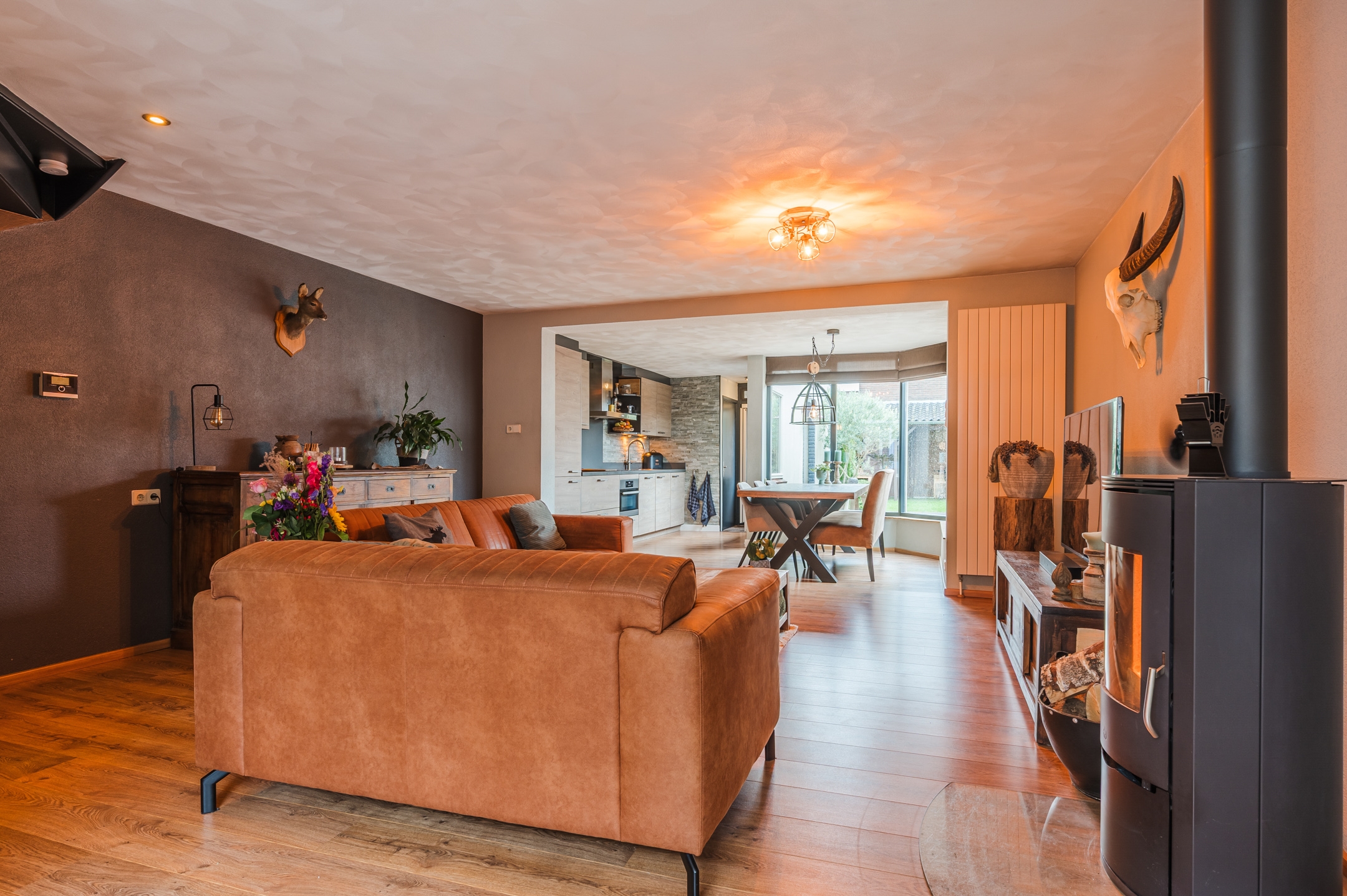 - Ruime, sfeervolle woonkamer met aanbouw, veel lichtinval en gezellige houtkachel (ter overname) – de perfecte plek om te ontspannen.