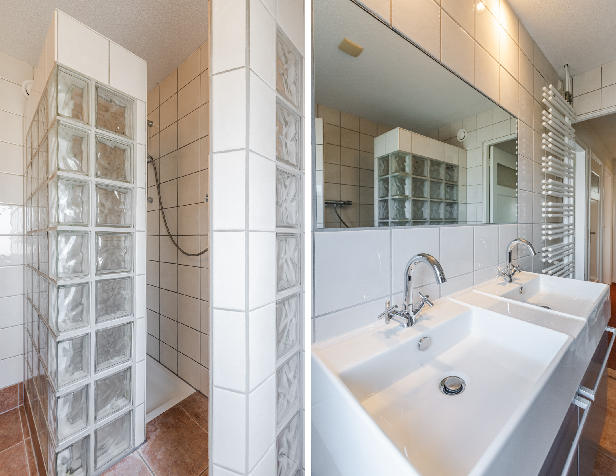 - Moderne badkamer met inloopdouche, dubbel wastafelmeubel, zwevend toilet en vloerverwarming