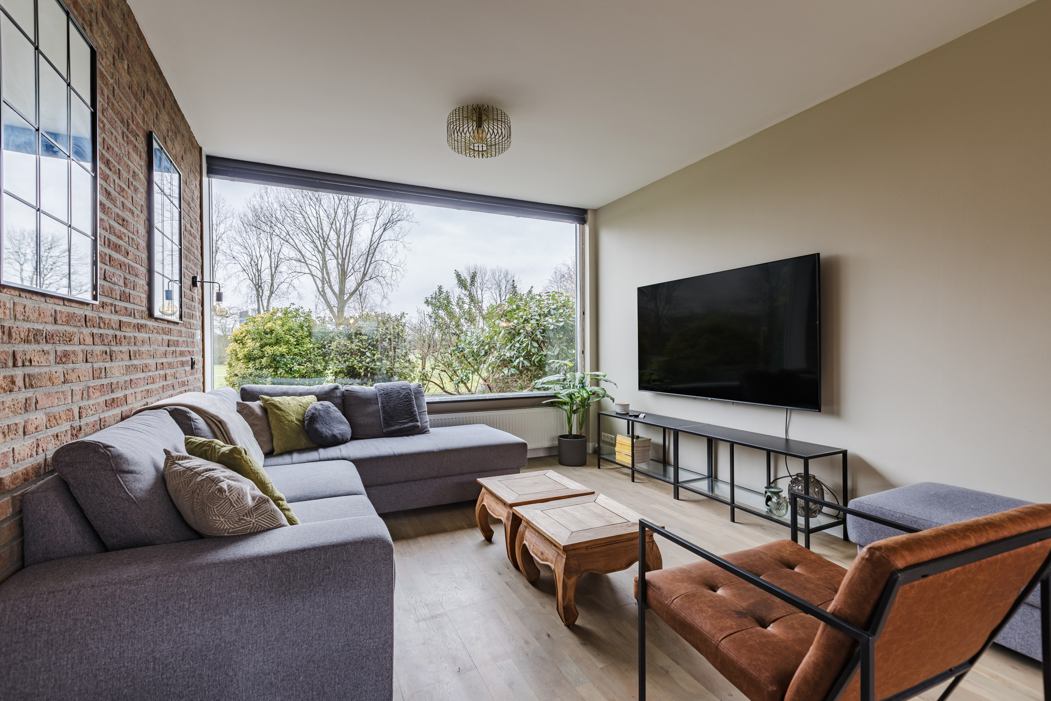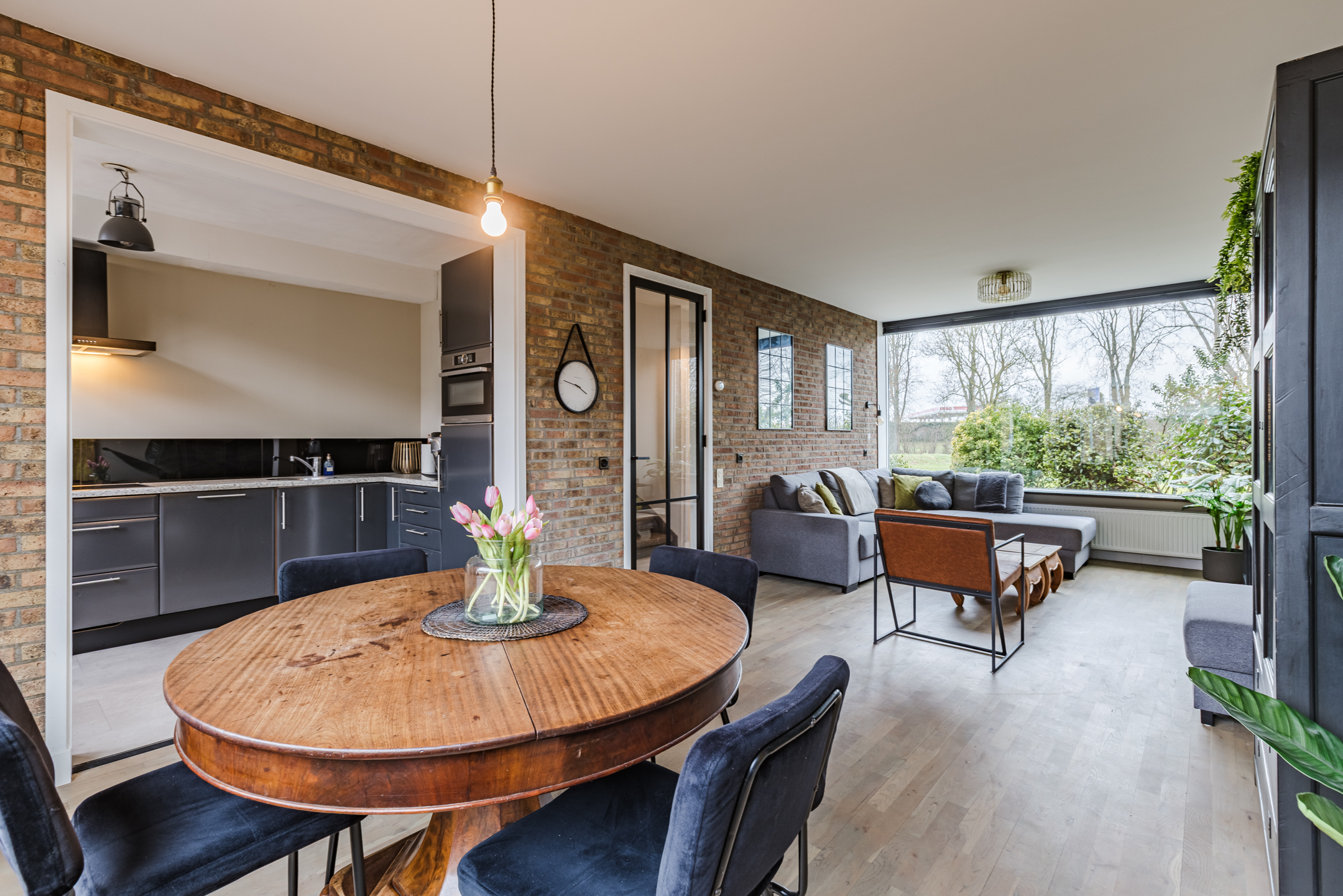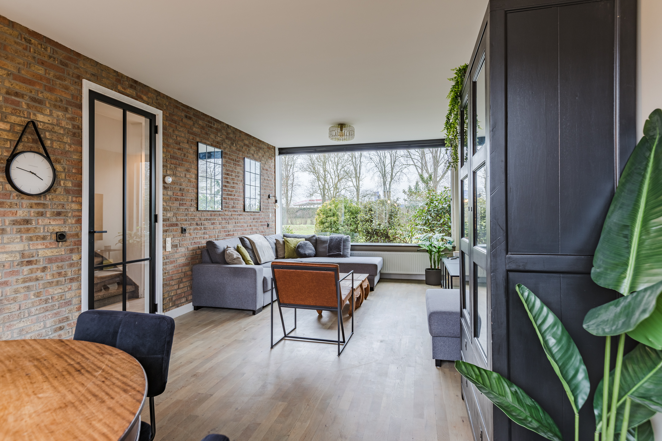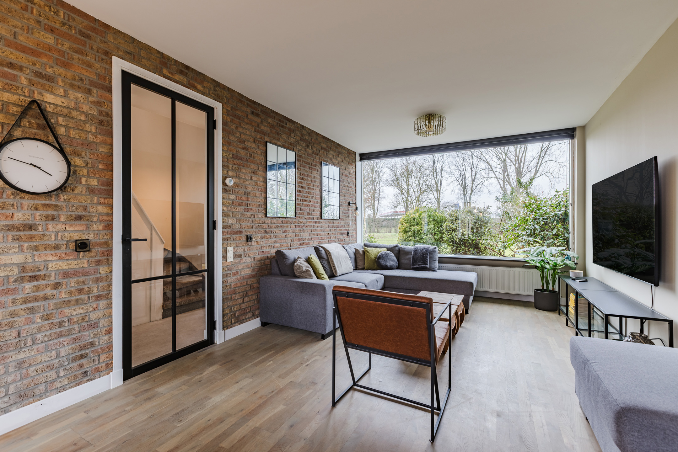 • Sfeervolle en lichte woonkamer met prachtig vrij uitzicht over het park aan de voorzijde, voorzien van een stijlvolle zwartstalen deur en een fraaie houten vloer