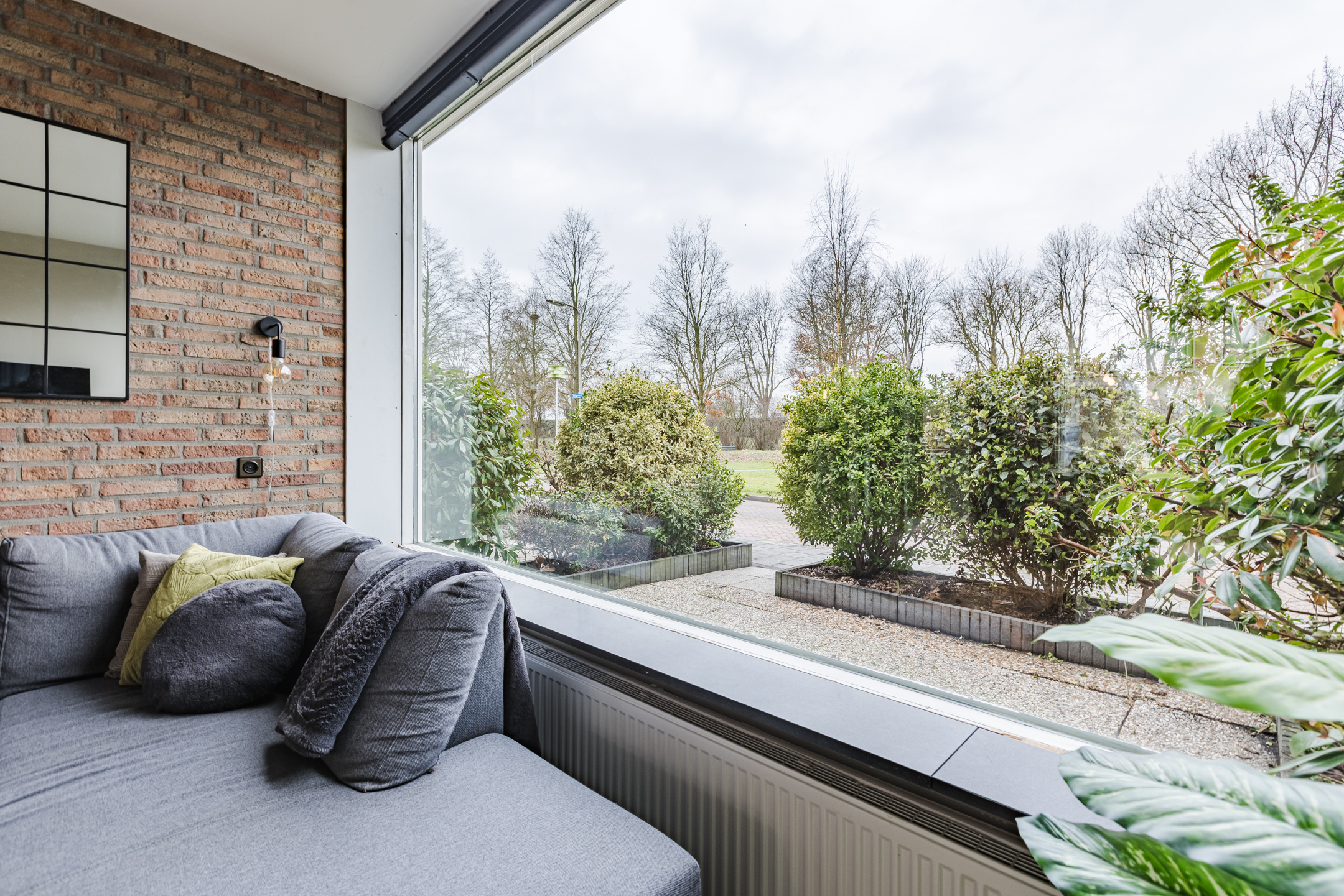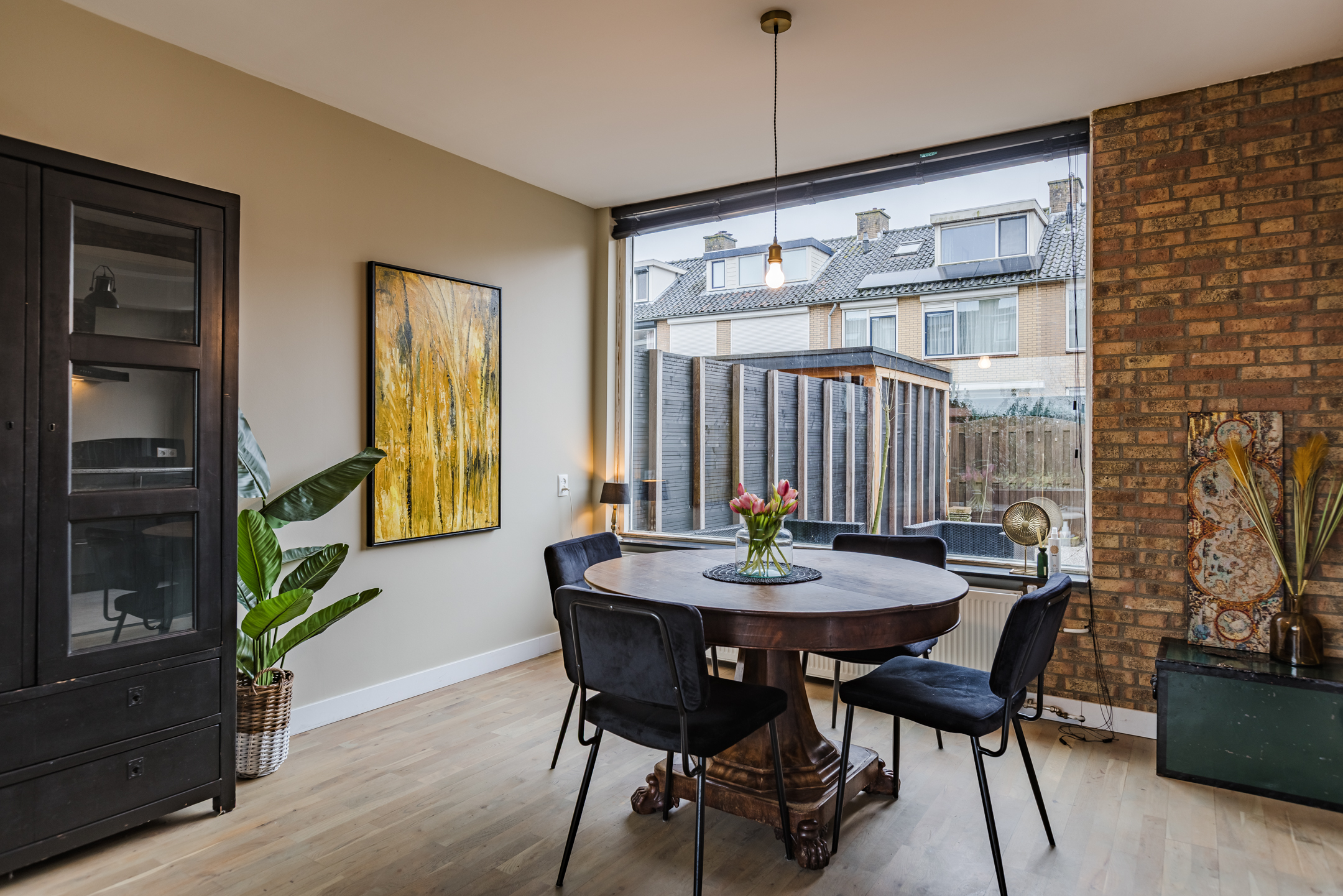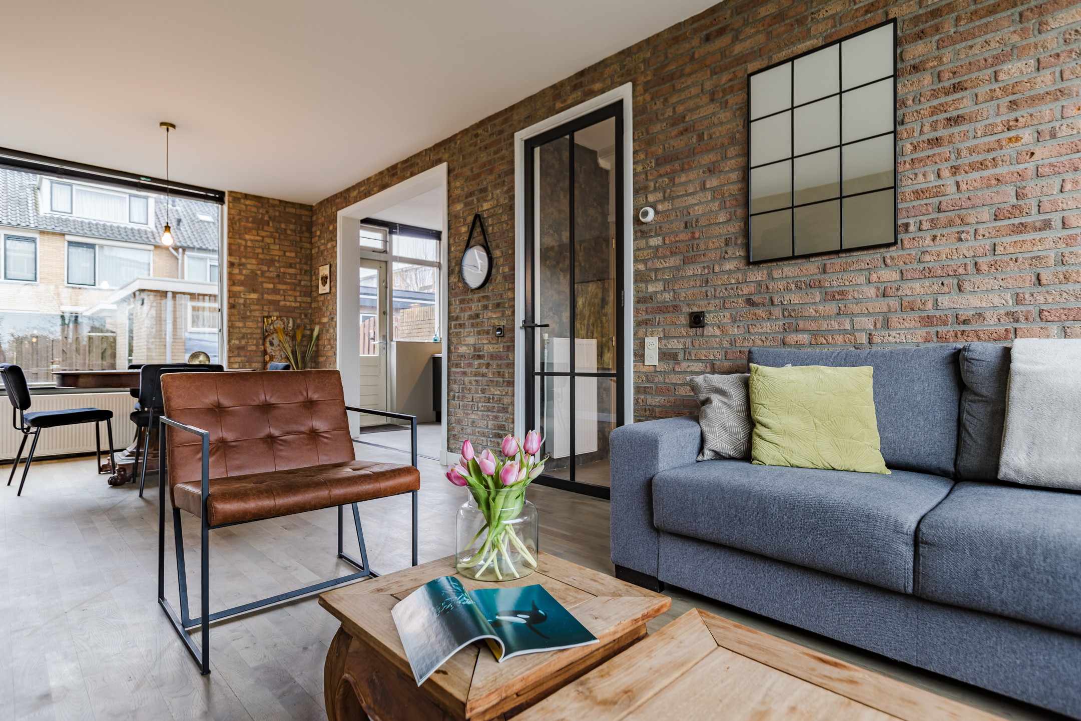 • Sfeervolle en lichte woonkamer met prachtig vrij uitzicht over het park aan de voorzijde, voorzien van een stijlvolle zwartstalen deur en een fraaie houten vloer