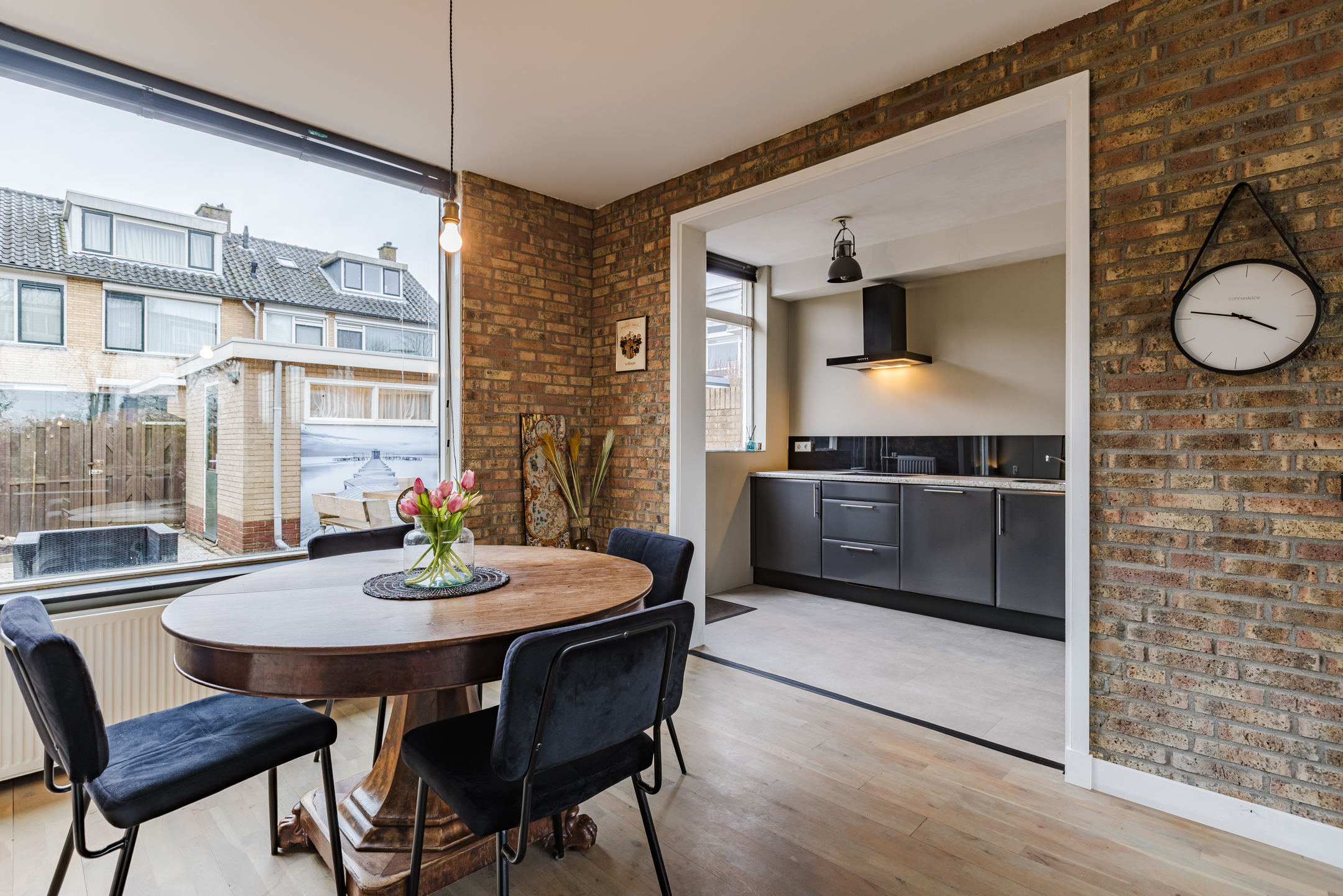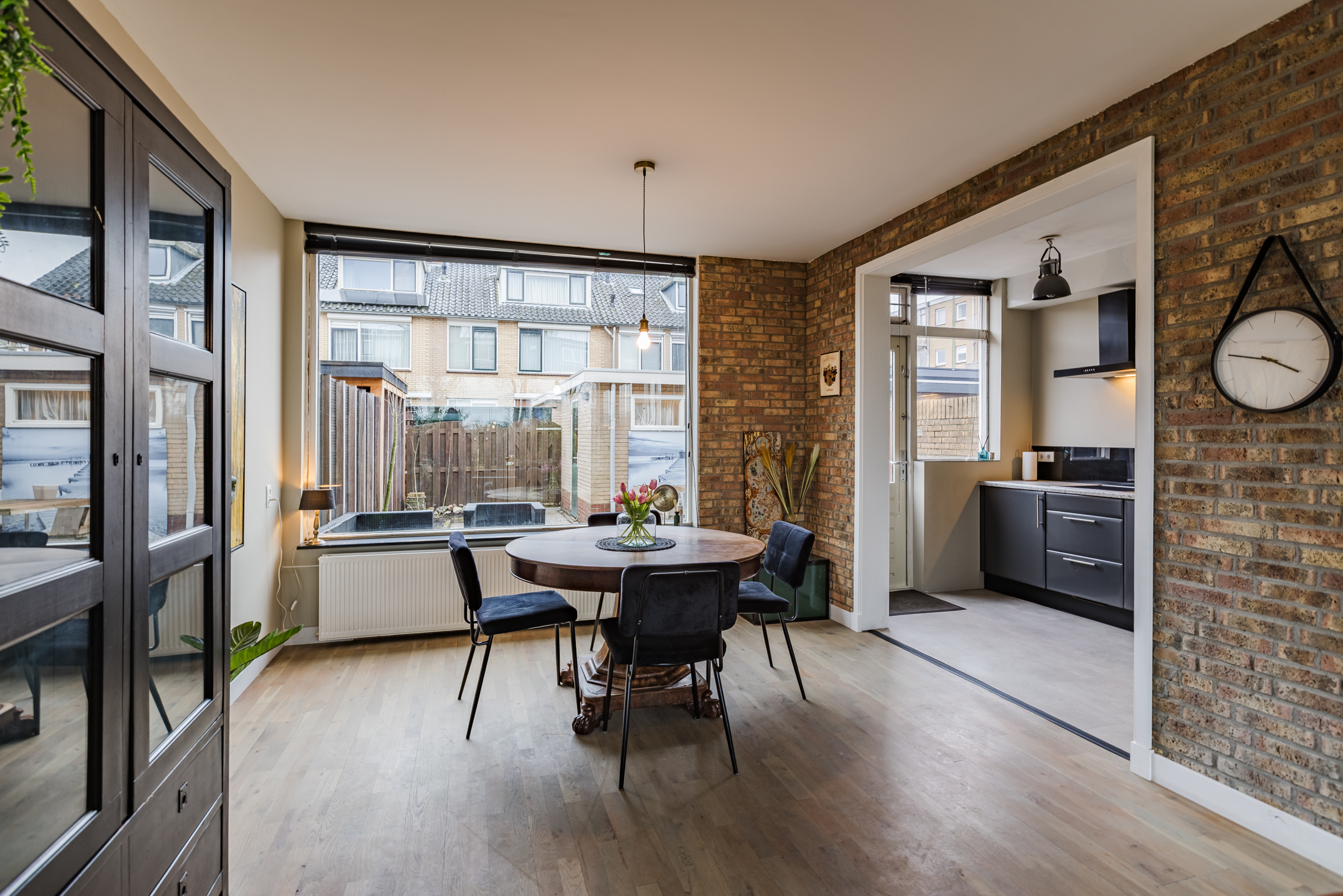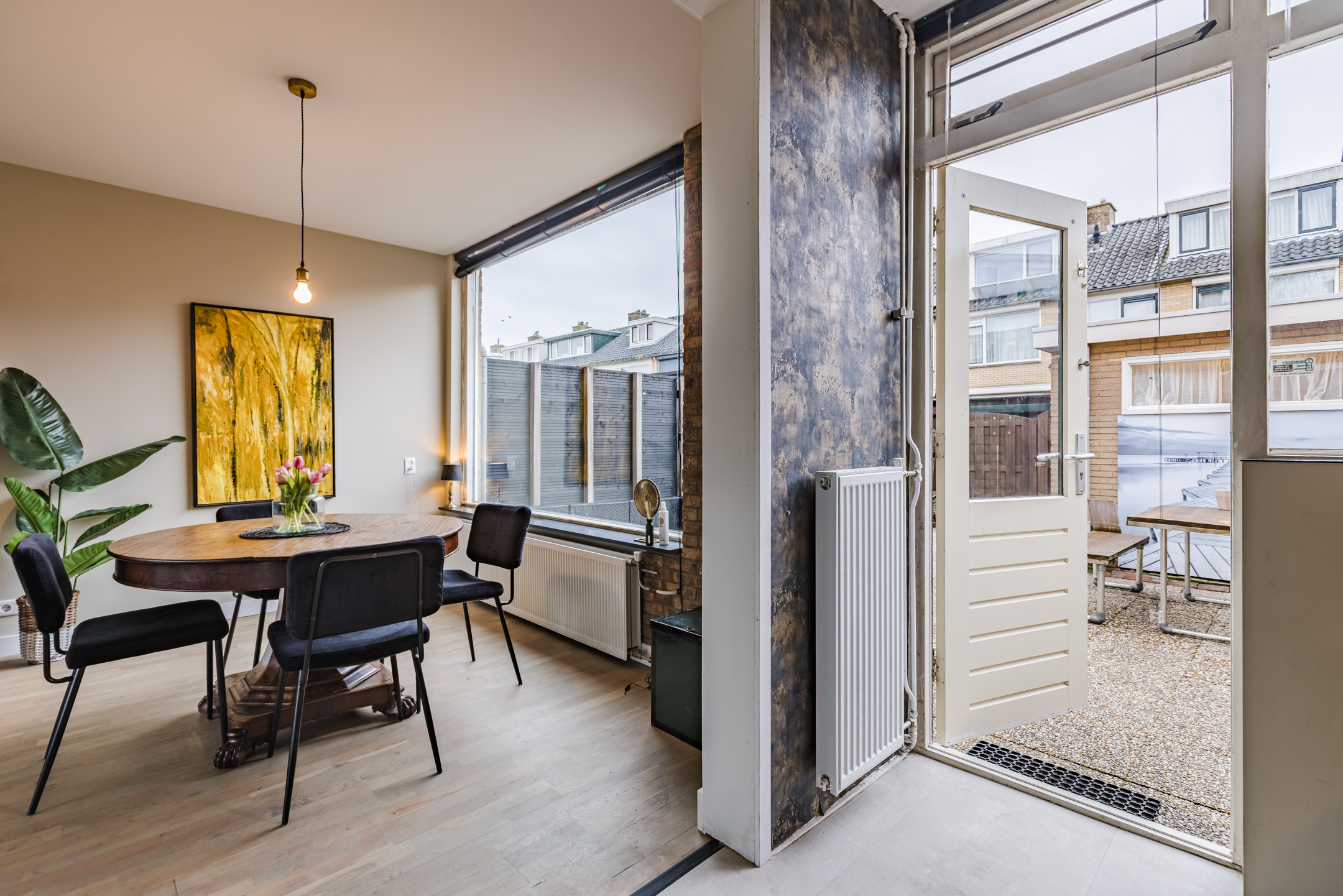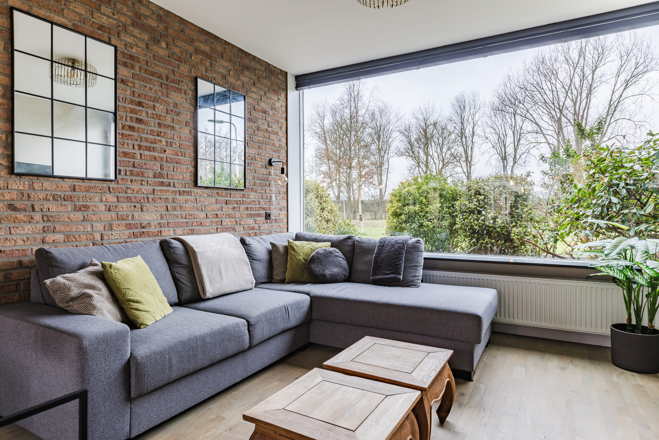 • Sfeervolle en lichte woonkamer met prachtig vrij uitzicht over het park aan de voorzijde, voorzien van een stijlvolle zwartstalen deur en een fraaie houten vloer